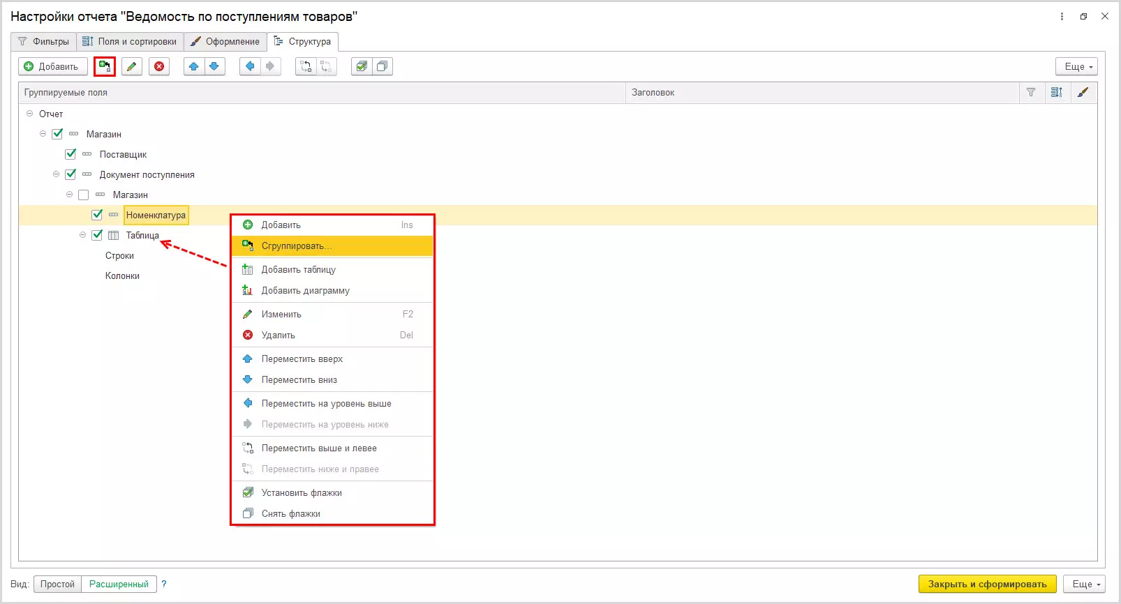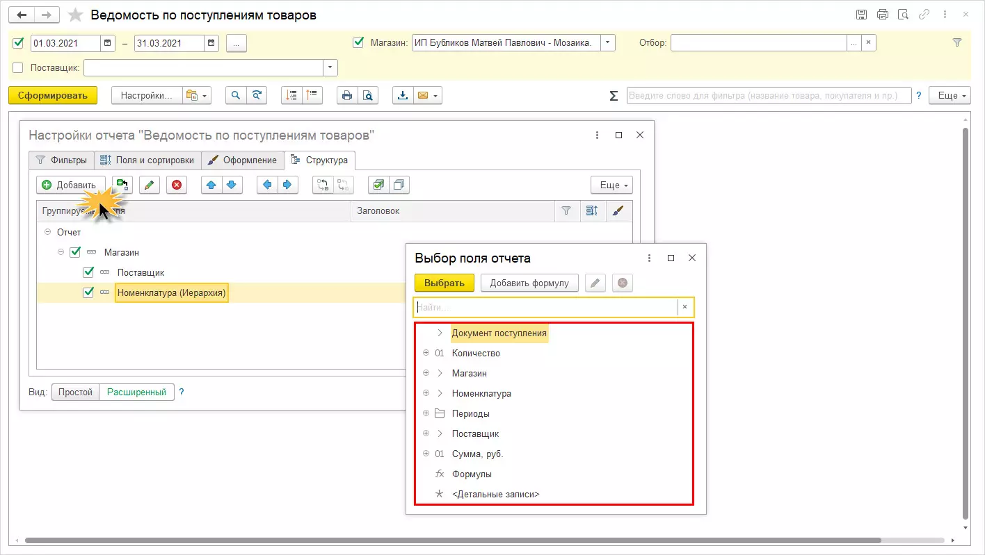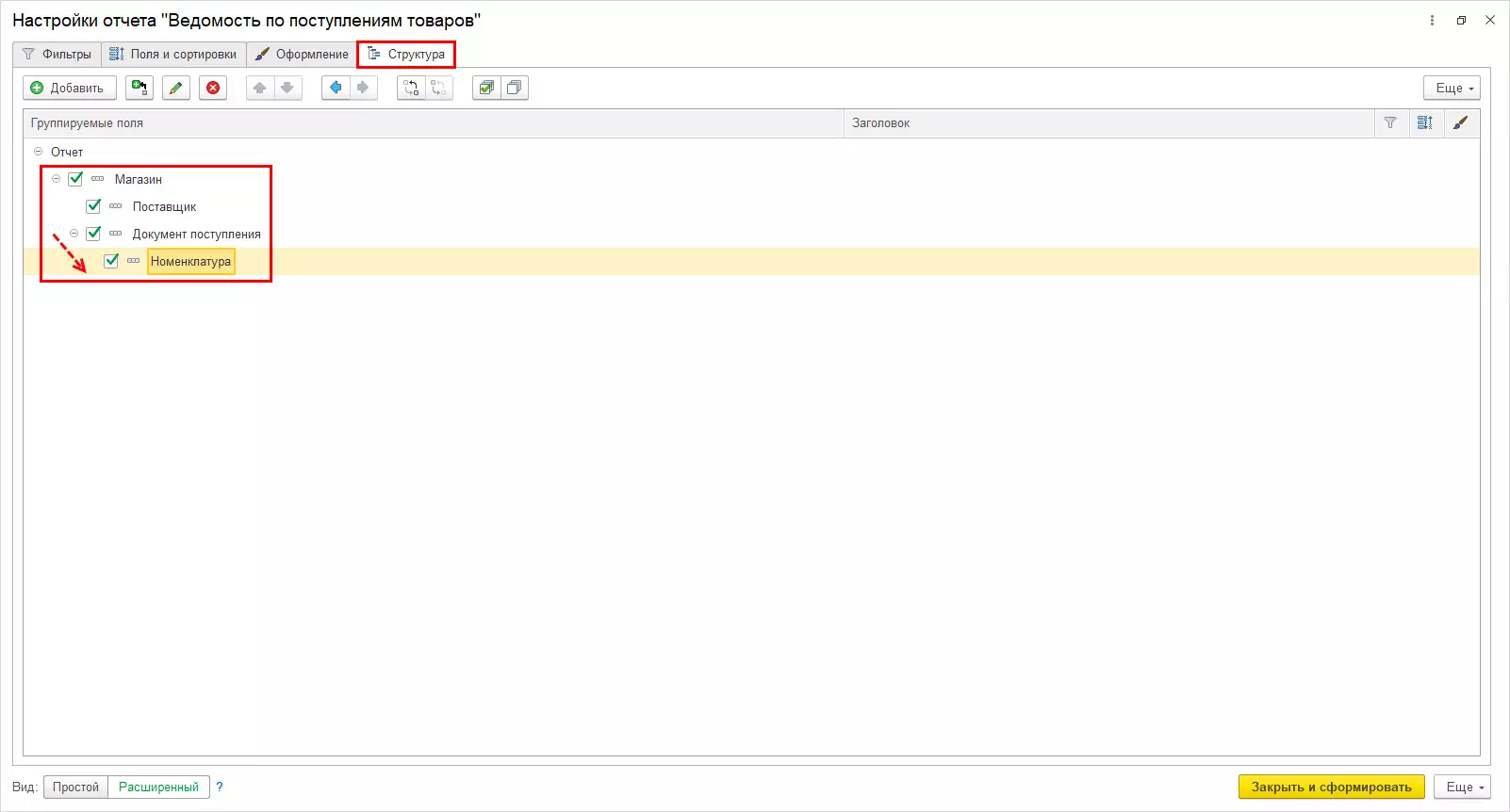 Шаг 12. Уберите иерархию поля Номенклатура и сместите поле, потянув мышкой, в подчинение полю Документ поступления.