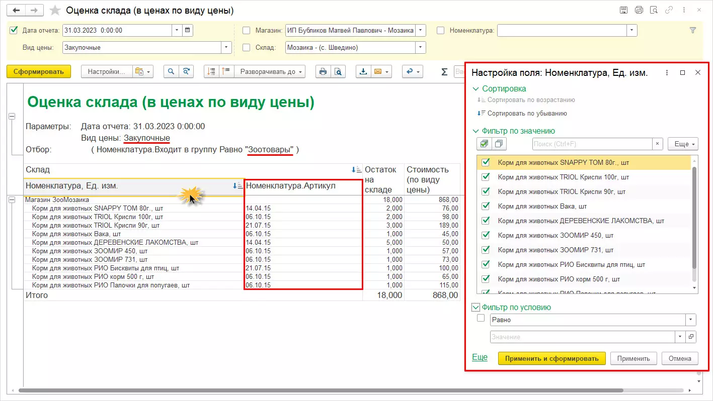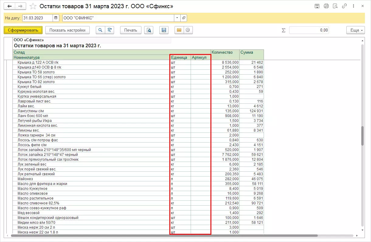 В отчете отразилась информация об артикуле товара и лишняя колонка Себестоимость спрятана.