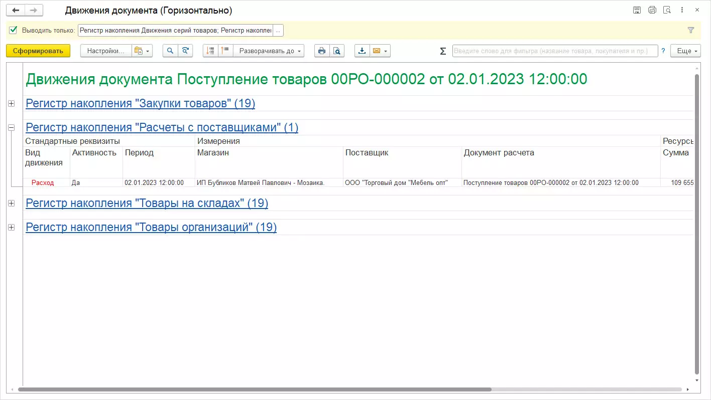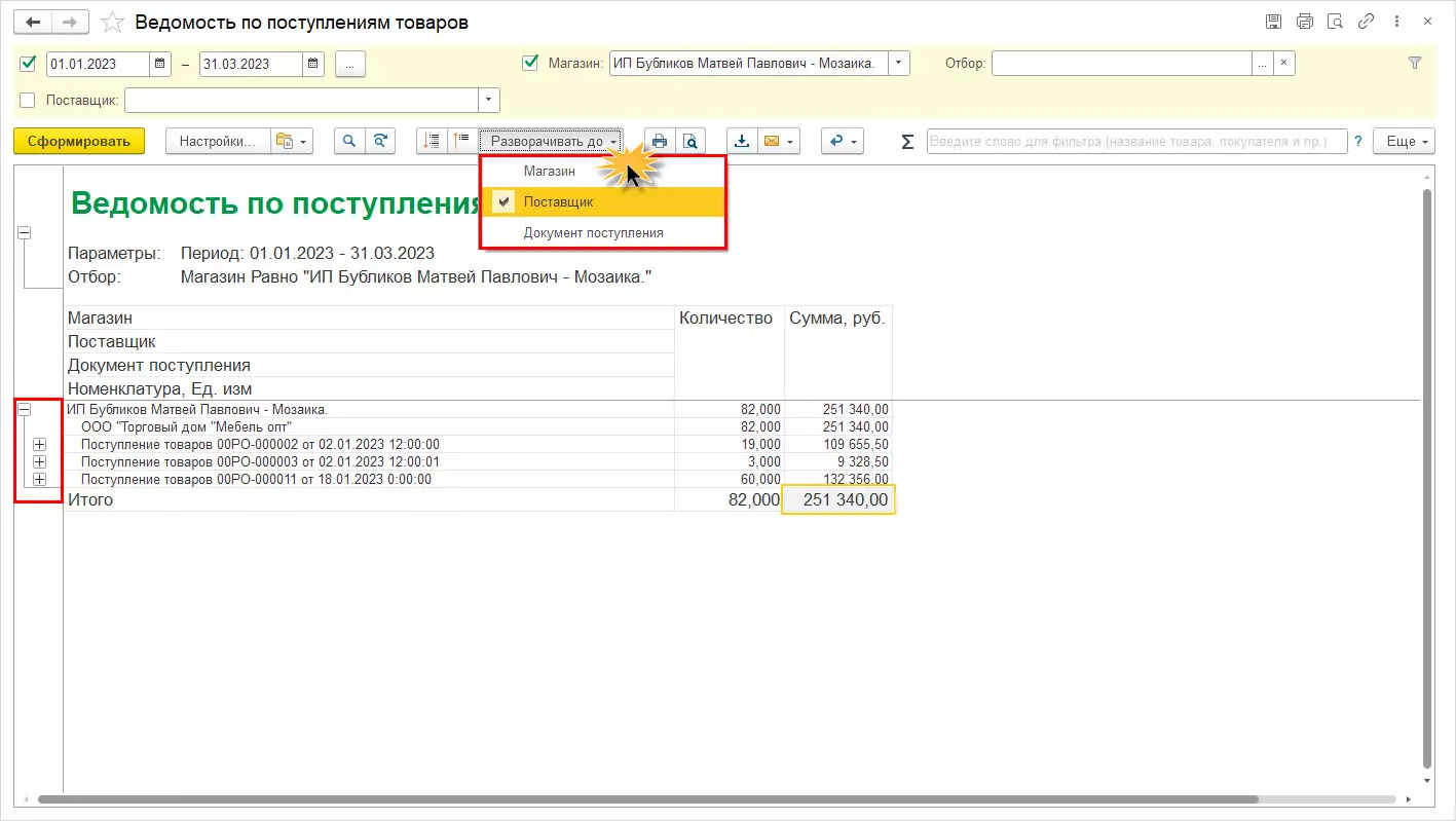 В нашем примере – Разворачивать до Поставщик. Все документы и номенклатура свернулись до поля с наименованием поставщика – ООО Торговый дом «Мебель Опт».