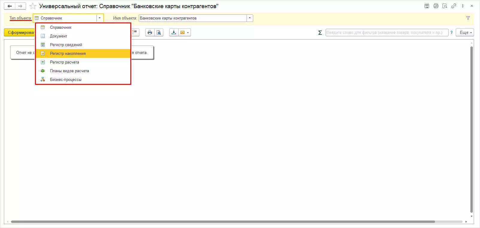 При выборе типа объекта представляется возможность выбрать вид информации для анализа. Это могут быть как данные справочников, регистры сведений, документы, бизнес-процессы, так и интересующие на данный момент нас регистры накопления.