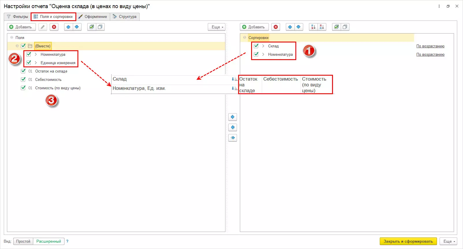 В правой части окна Сортировки выделены строки, по которым хотим получить детализацию в отчете – п.1 – Склады и Номенклатура. Т.е. сначала выводится склад, затем номенклатура и, соответственно, сортировка производится в этой последовательности.