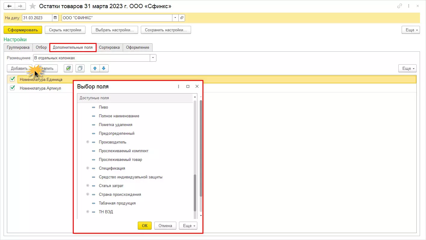 Вернемся к отчету Остатки товаров. Добавим дополнительные поля Единица измерения и Артикул.