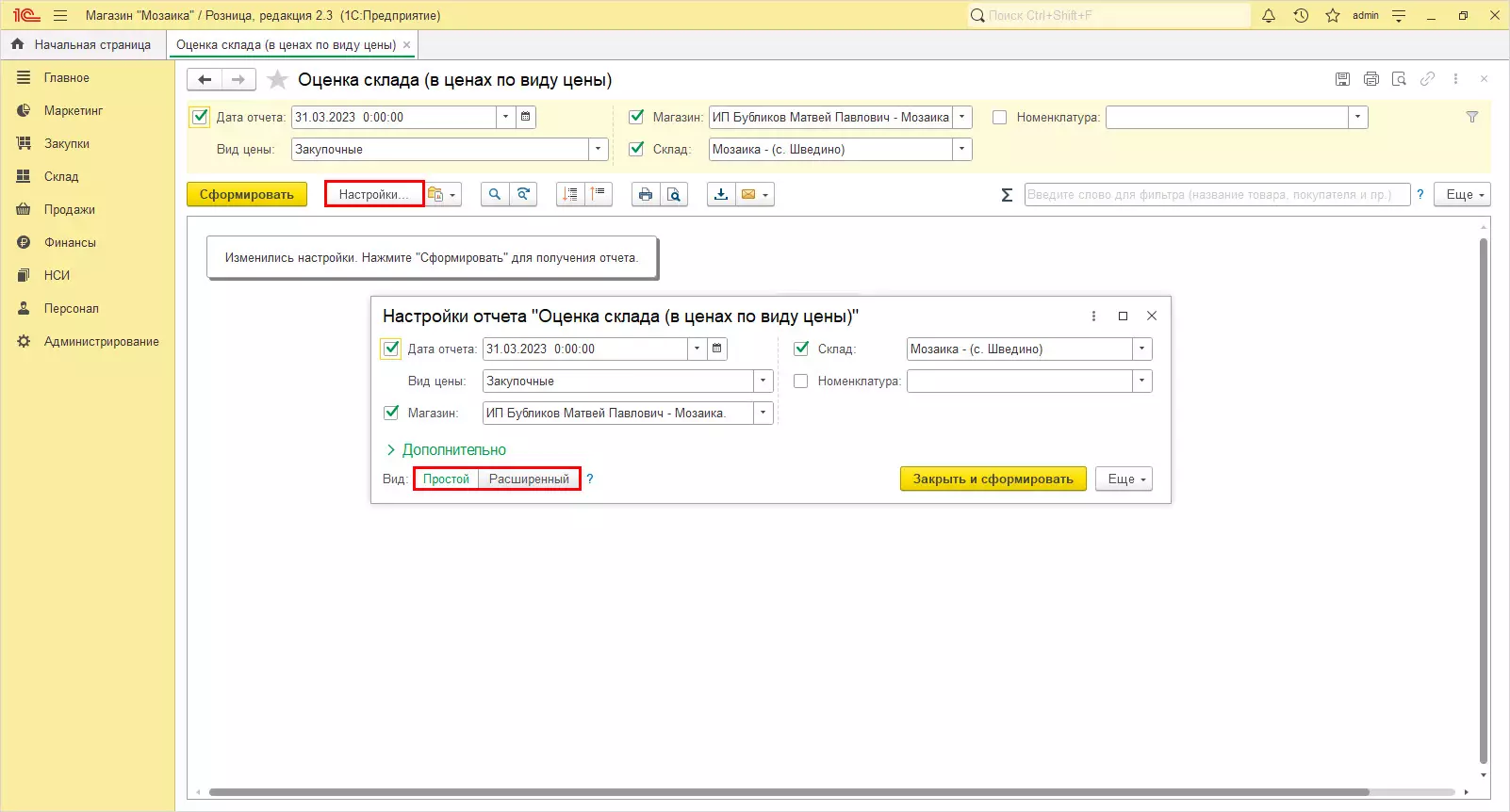 Шаг 1. Раскройте настройки отчета, нажав одноименную кнопку. В нижней части отображен переключатель между простой и расширенной настройкой.
