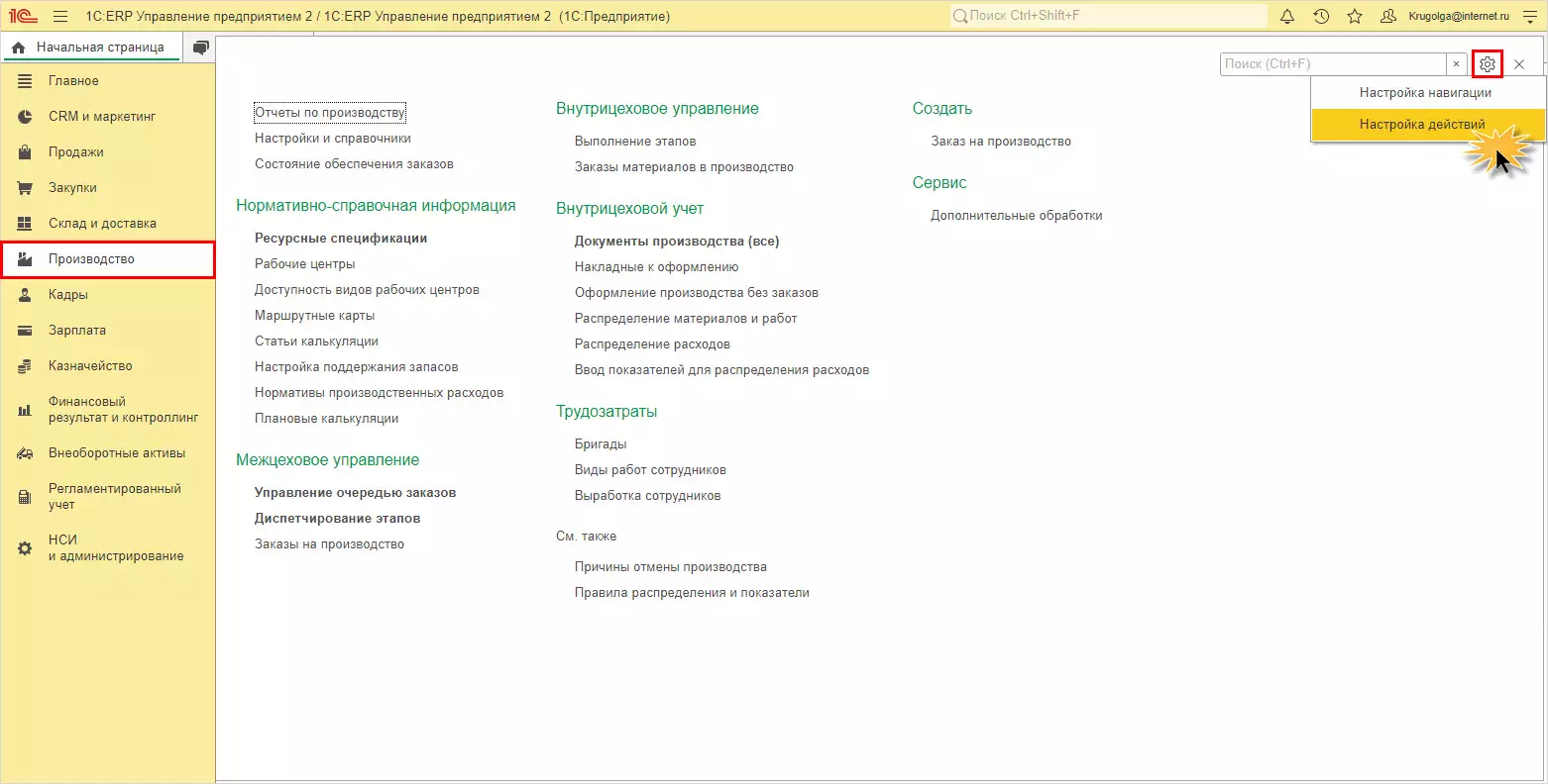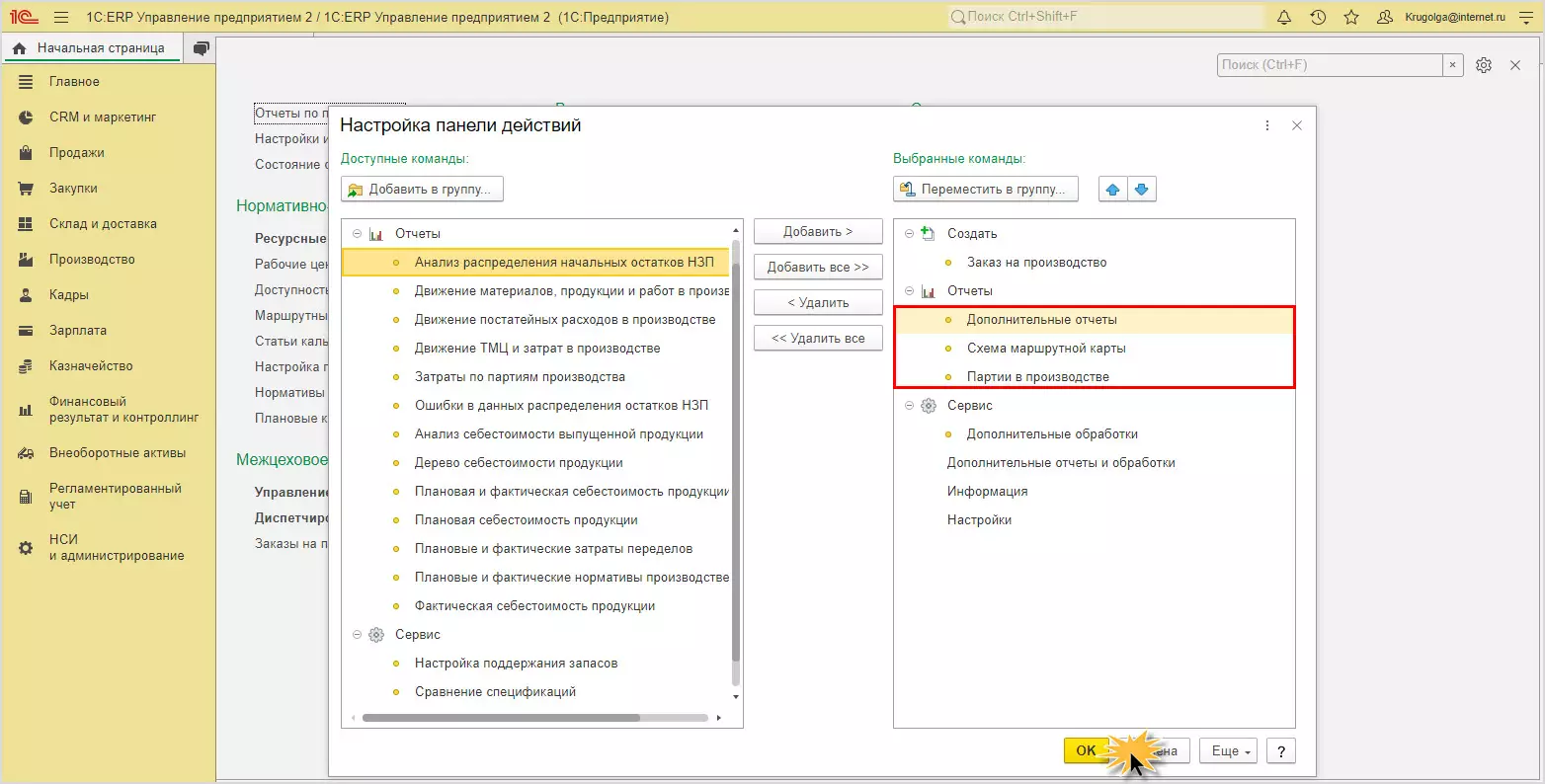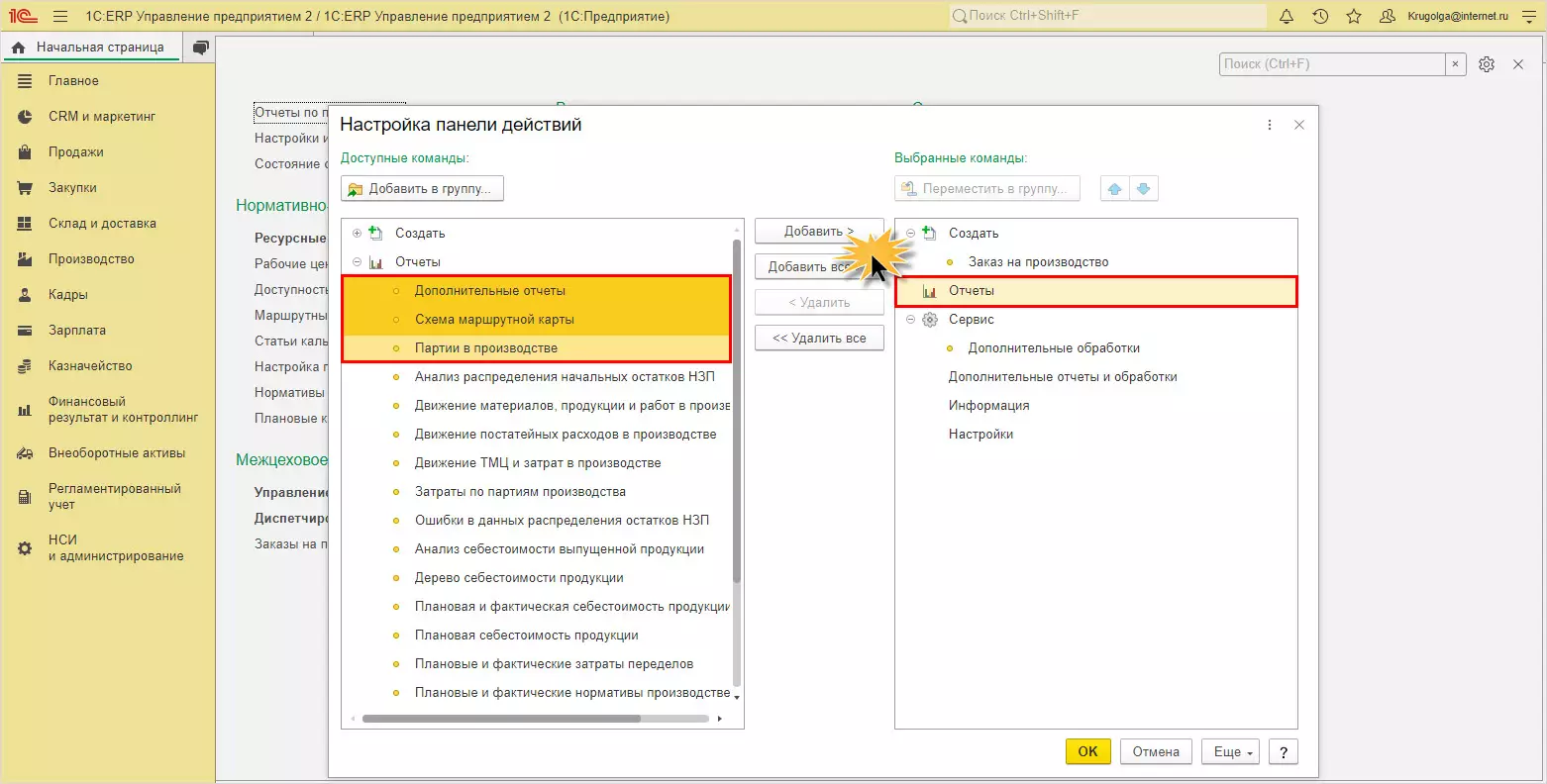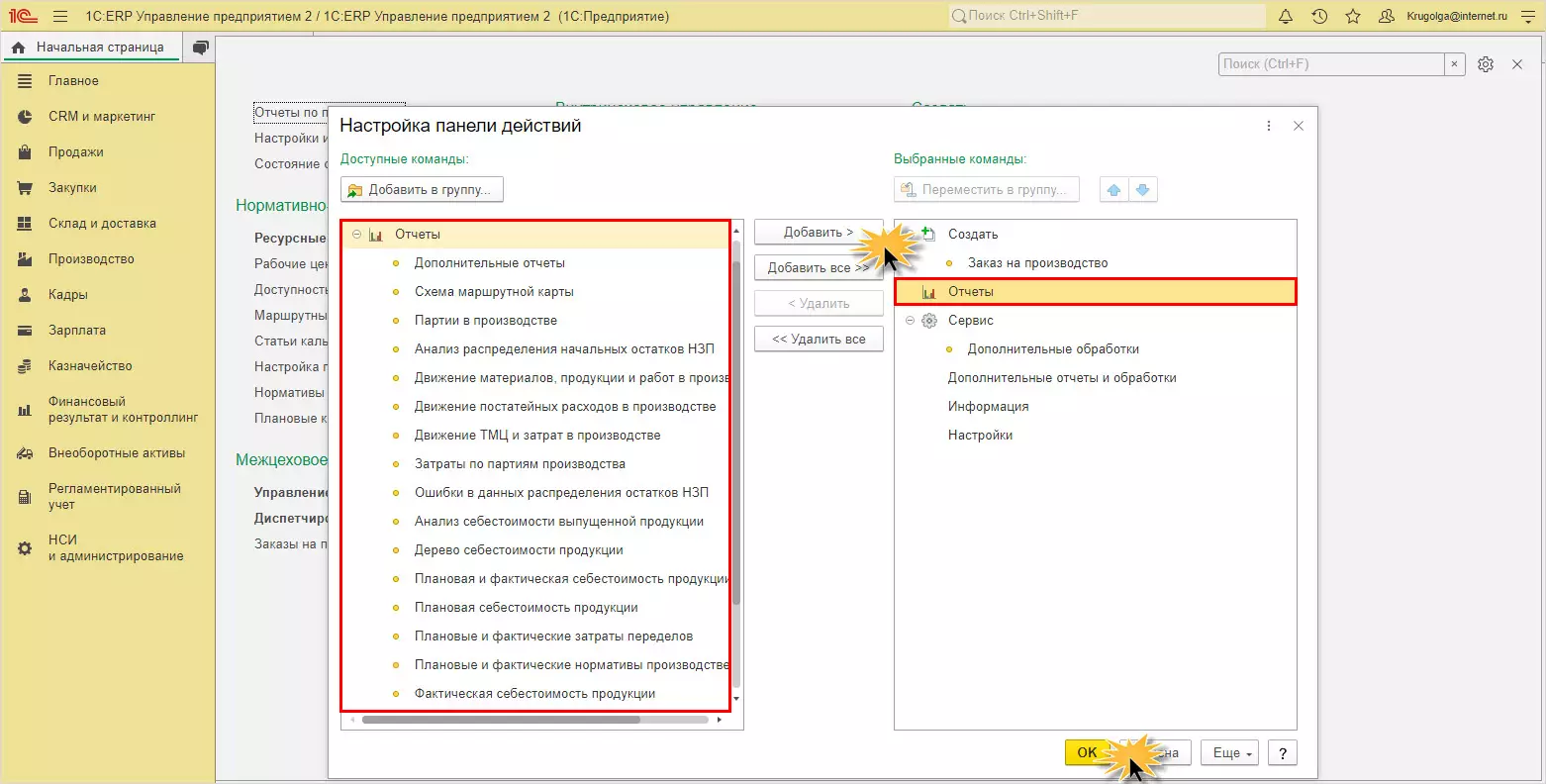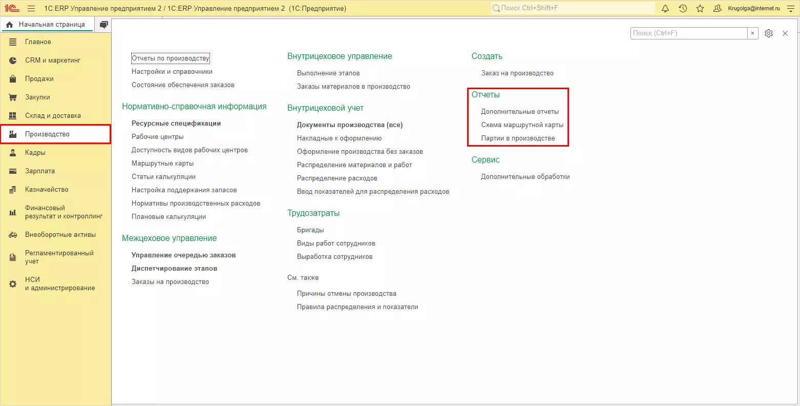 Например, в 1С:ERP в разделе «Производство» не вынесен пункт «Отчеты».