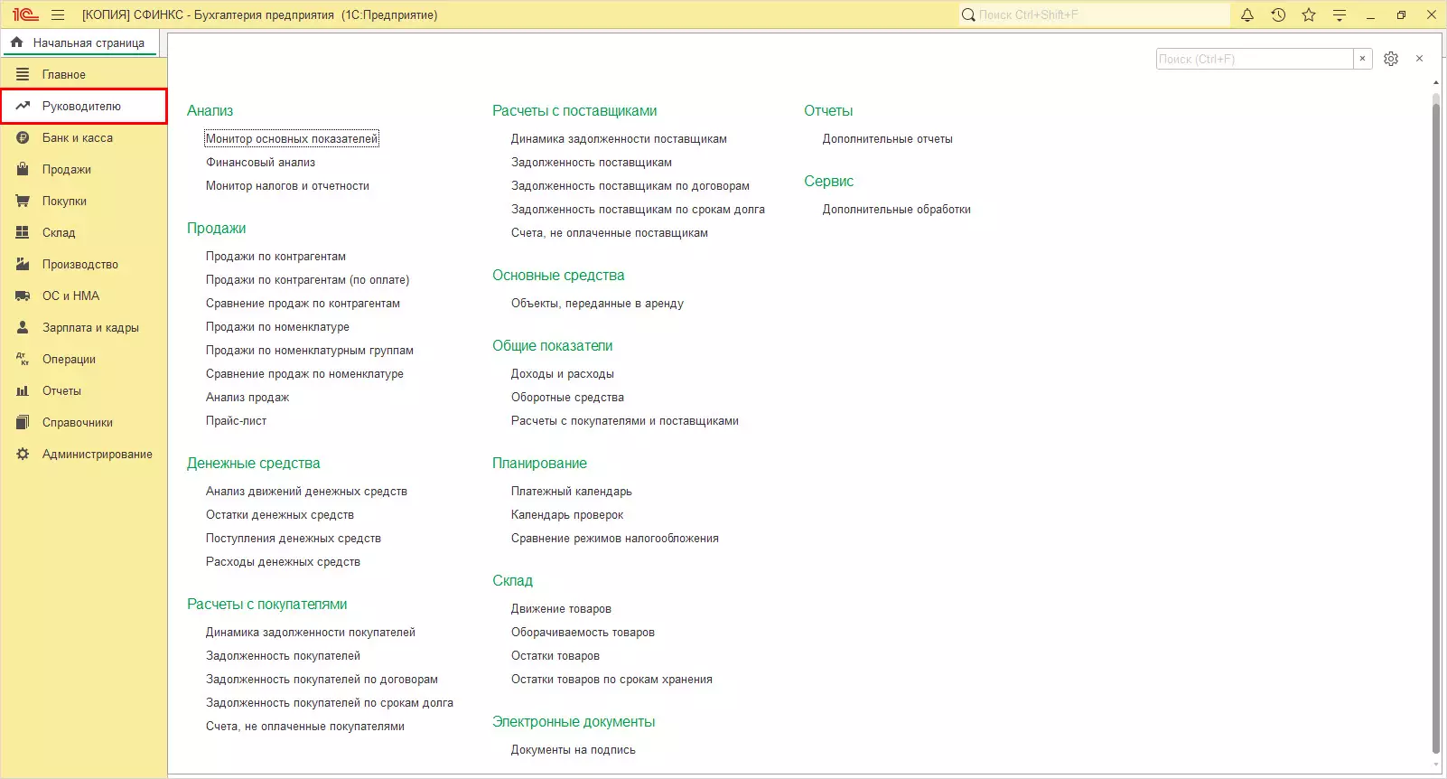 В 1С:Бухгалтерии выделен отдельный раздел аналитических отчетов – раздел «Руководителю».