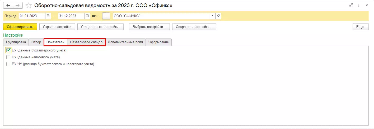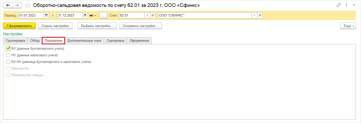 Бухгалтерские отчеты в ряде настроек имеют вкладку Показатели. Установив галочки, в отчете можно отразить не только данные бухгалтерского учета (БУ), но и налогового учета (НУ). Для некоторых счетов (активно-пассивных) показать развернутое сальдо.