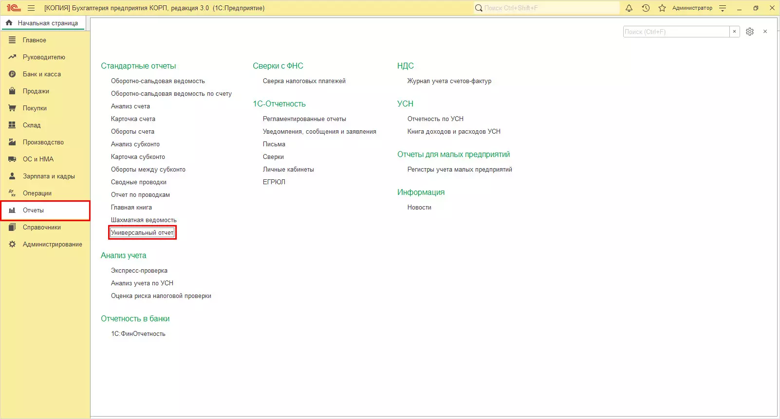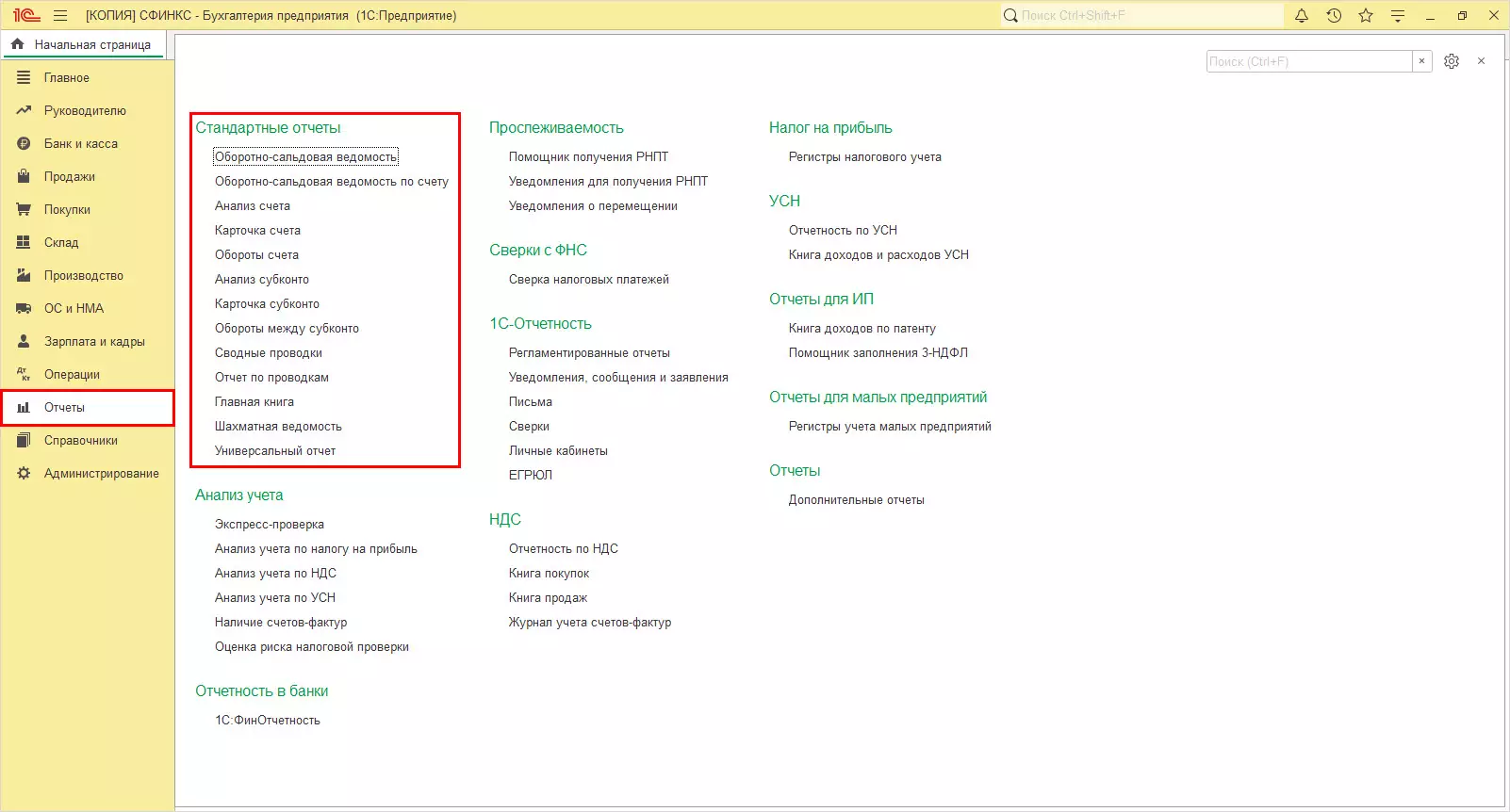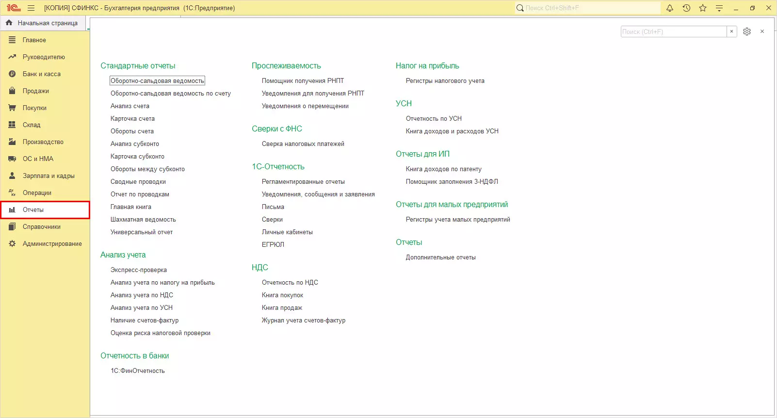В некоторых конфигурациях дополнительно выделен пункт меню «Отчеты», где они сгруппированы по блокам. Пример на рисунке ниже – 1С:Бухгалтерия предприятия.