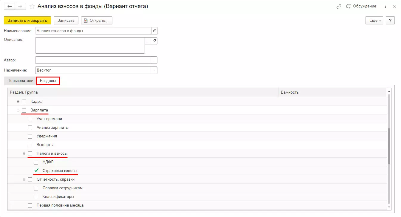 На вкладке Разделы определяется расположение выбранного отчета. В нашем примере: раздел «Зарплата» – подраздел «Налоги и взносы» – Страховые взносы.