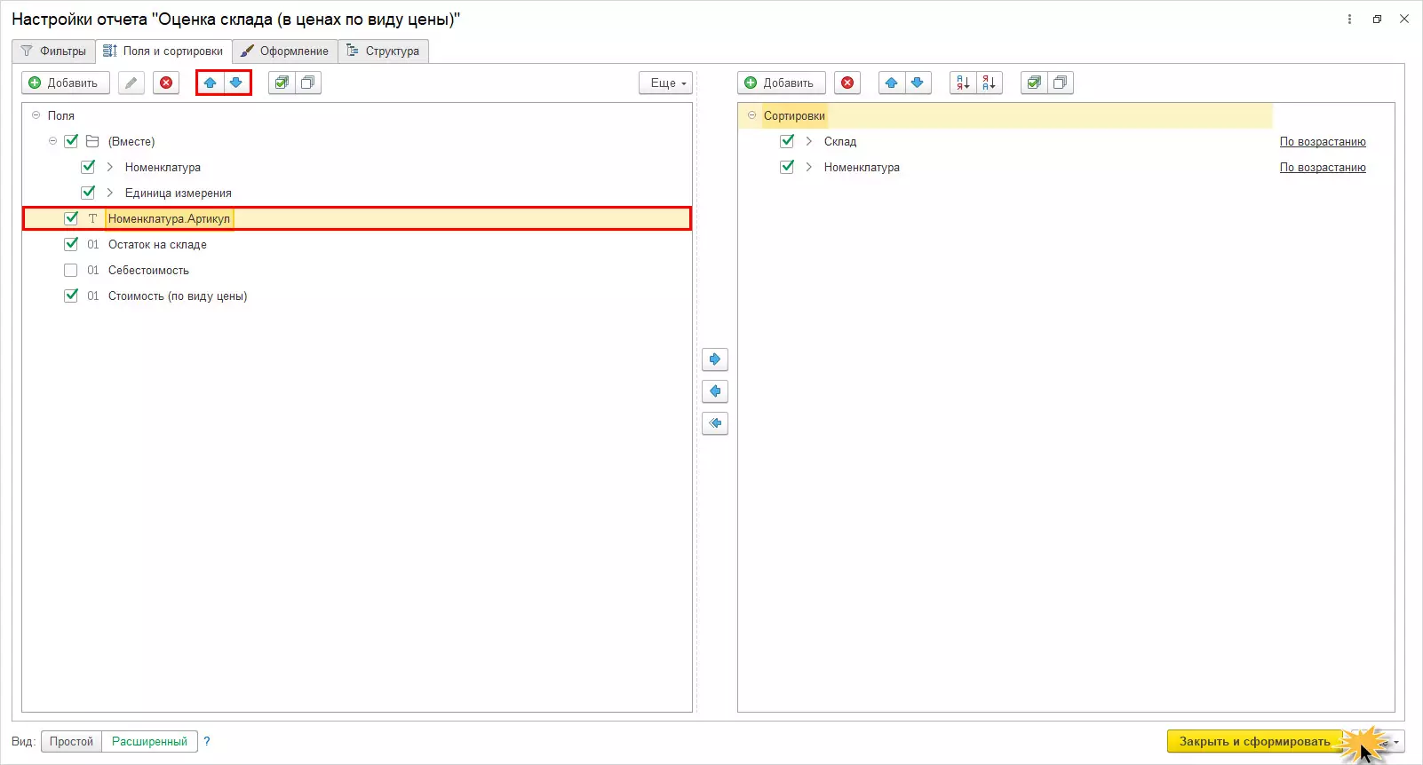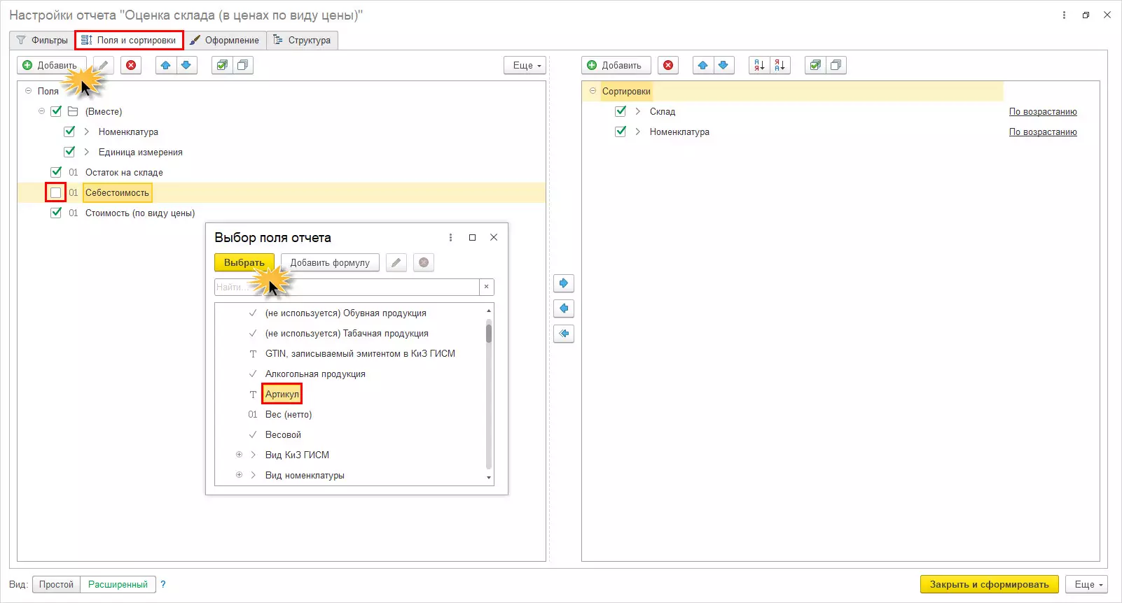 Например, отключим сведения о себестоимости, сняв галочку и добавим поле Артикул.