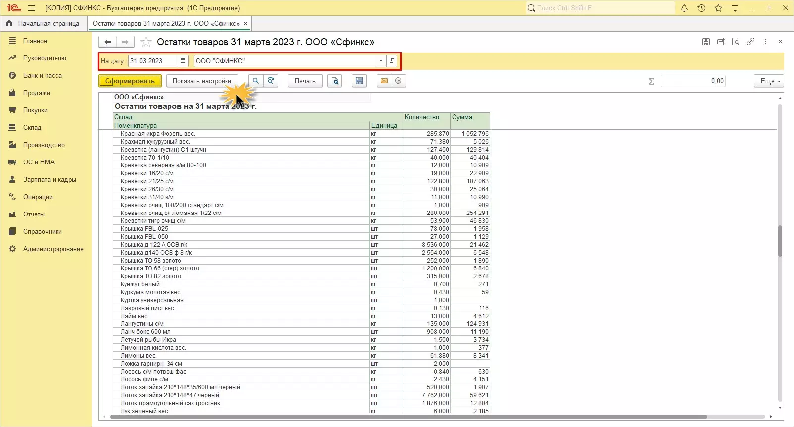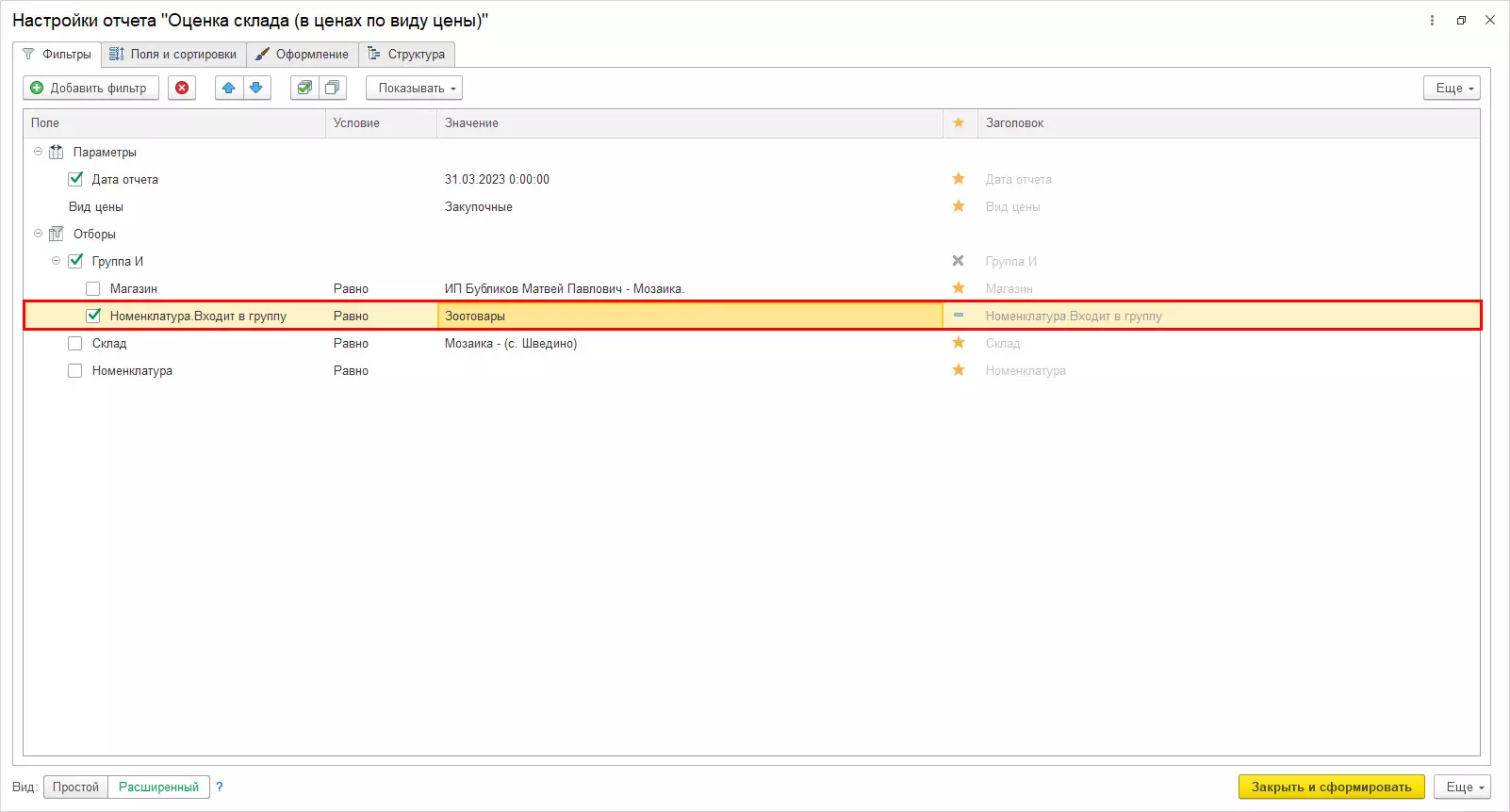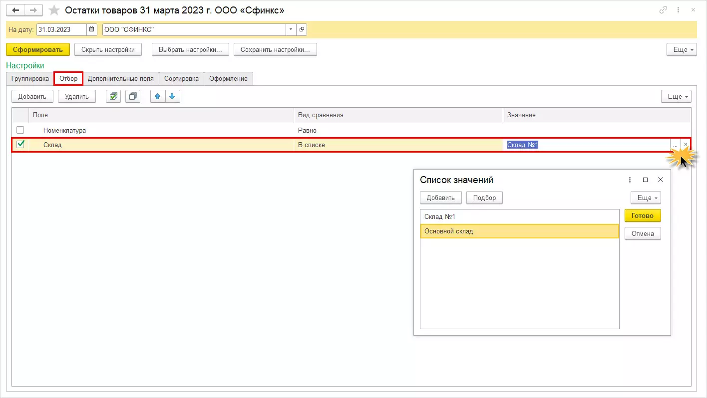 Ниже приведен пример отбора по складам в отчете «Остатки товаров»: