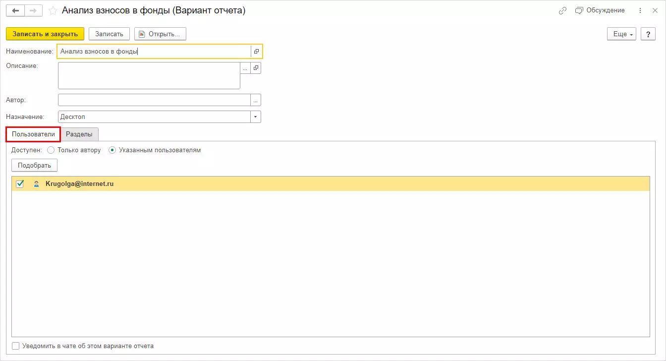 На вкладке Пользователи определяется доступность отчета пользователям.