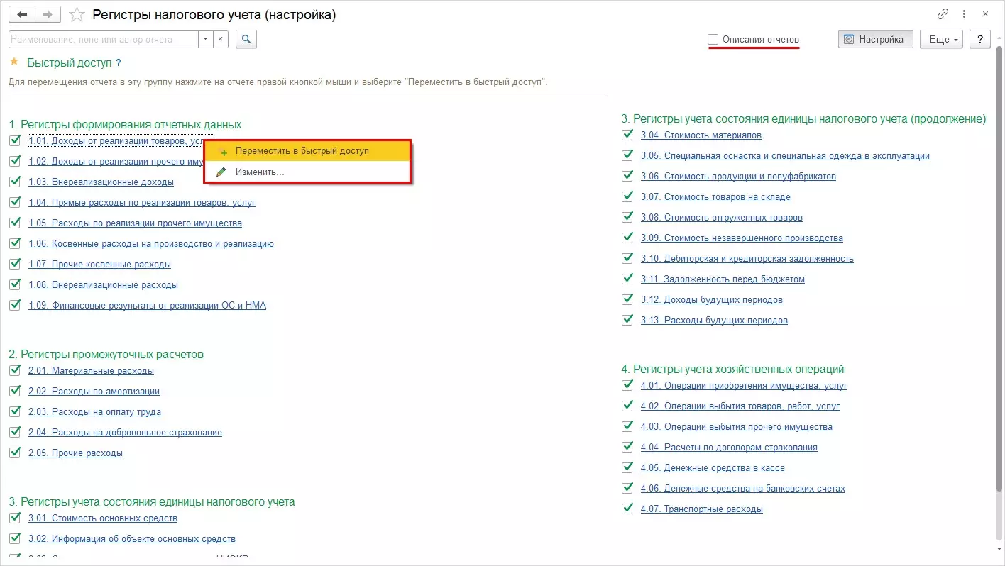 - Переместить в быстрый доступ – выбранные отчеты отражаются группой выше всего списка, в верхней части окна;