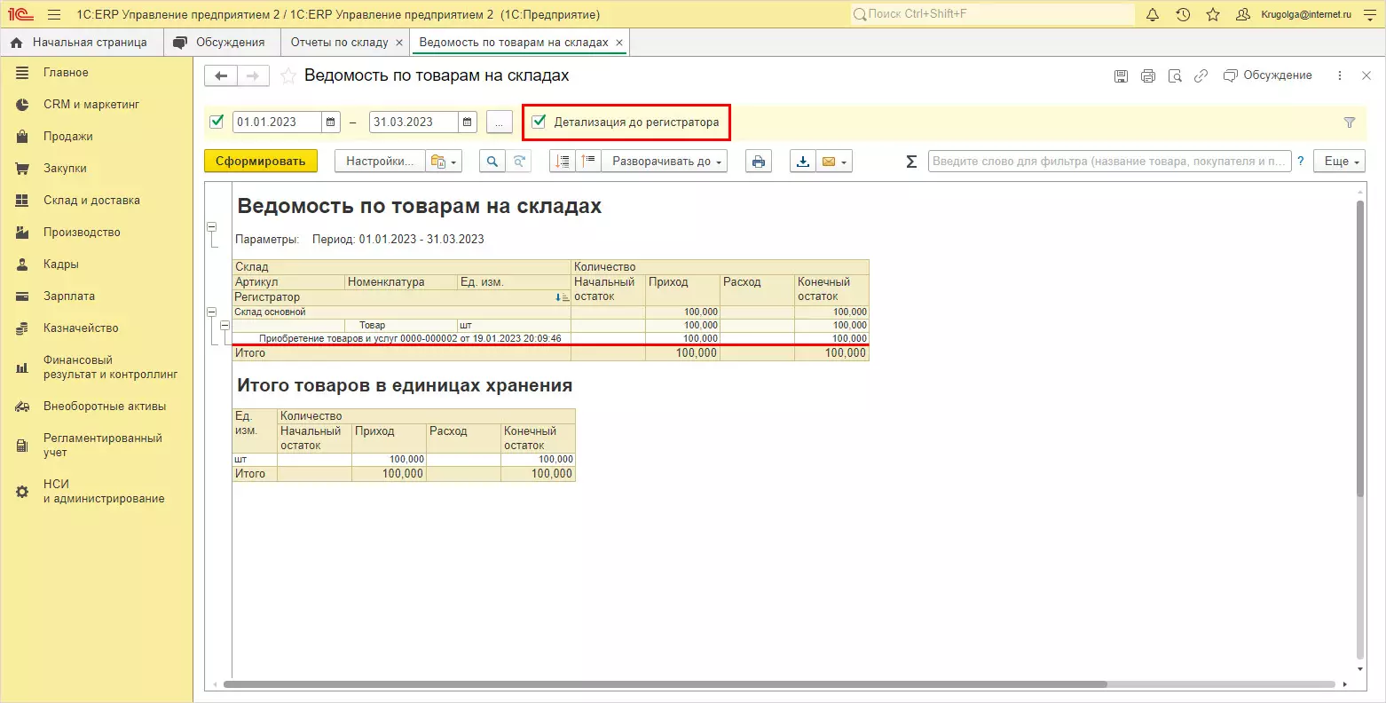 В некоторых конфигурациях есть возможность установить детализацию до регистратора в «шапке» настройки отчета. Ниже приведен пример отчета Ведомость по товарам на складах в 1С:ERP. Есть аналогичная настройка отчетов в 1С:Управление торговлей и 1С:Розница.