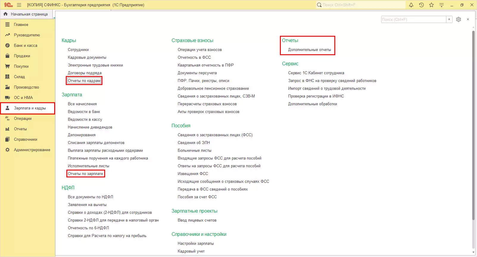 В любой конфигурации, в разделах для быстрого поиска пользователем расположены свои отчеты. Например, в БП раздел «Зарплата и кадры» есть «Отчеты по кадрам» и «Отчеты по зарплате».