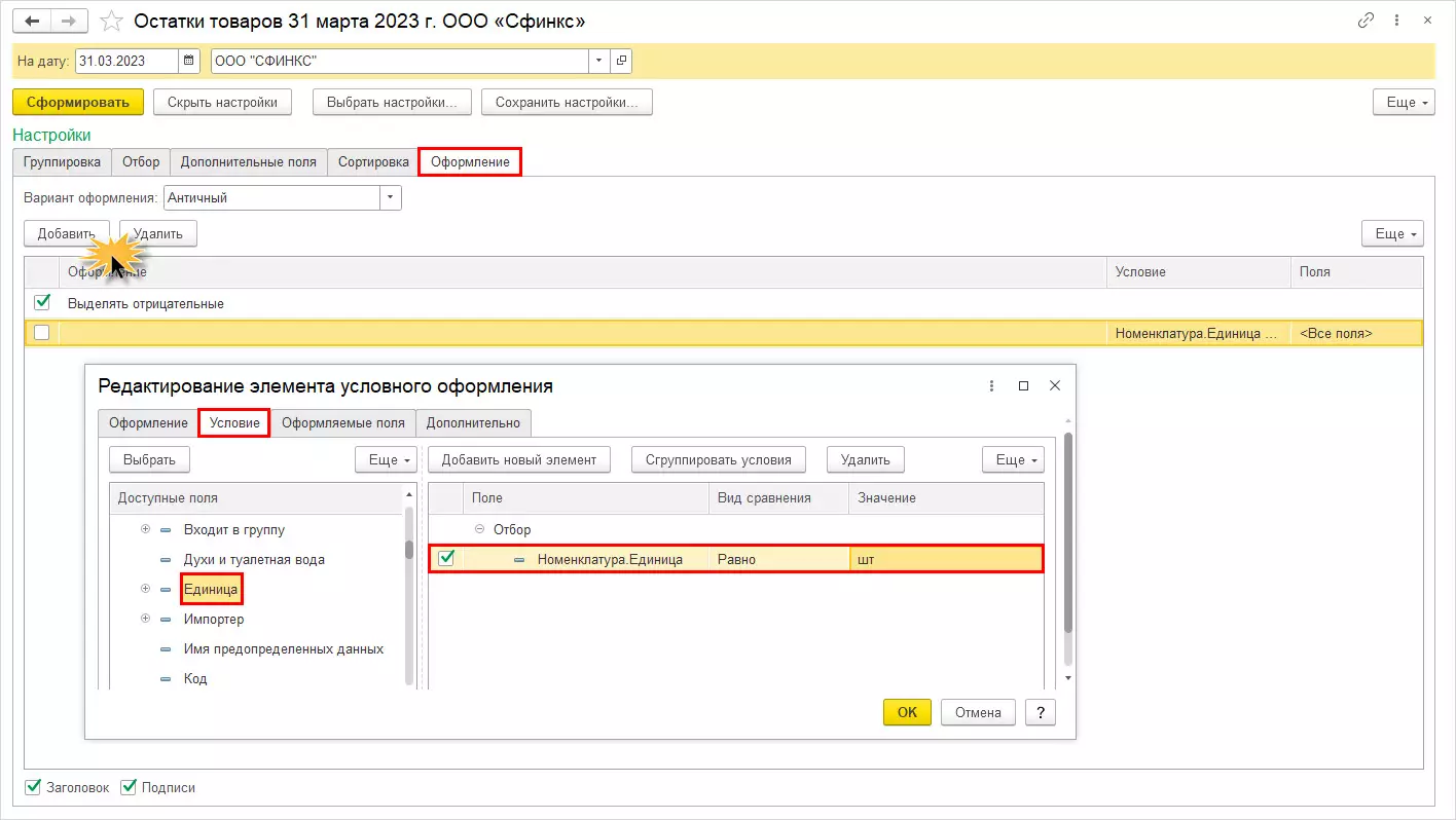 Второе – на вкладке «Условие» зададим его – «Единица» равно «Шт».
