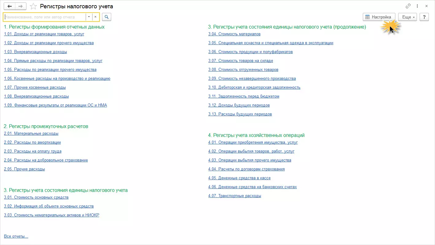 Работая со списком отчетов, пользователь также может настраивать эти списки. Пример – список отчетов в 1С:Бухгалтерия – Регистры налогового учета - раздел «Отчеты».
