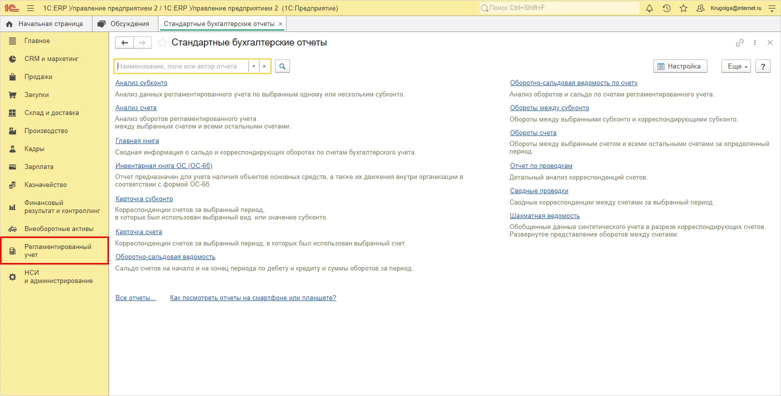 В 1С:ERP Стандартные бухгалтерские отчеты сгруппированы и расположены в разделе «Регламентированный учет».