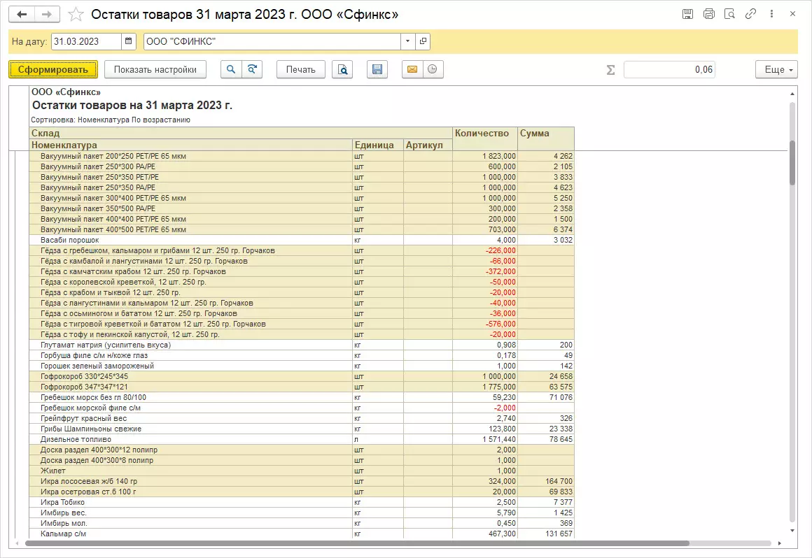 Установим галочку Выделять отрицательные. Эта предопределенная настройка позволит выявить «красные остатки» товаров.
