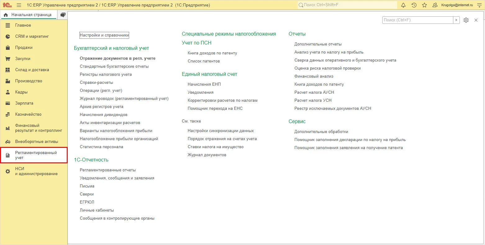 В 1С:ERP аналогичный раздел назван «Регламентированный учет».