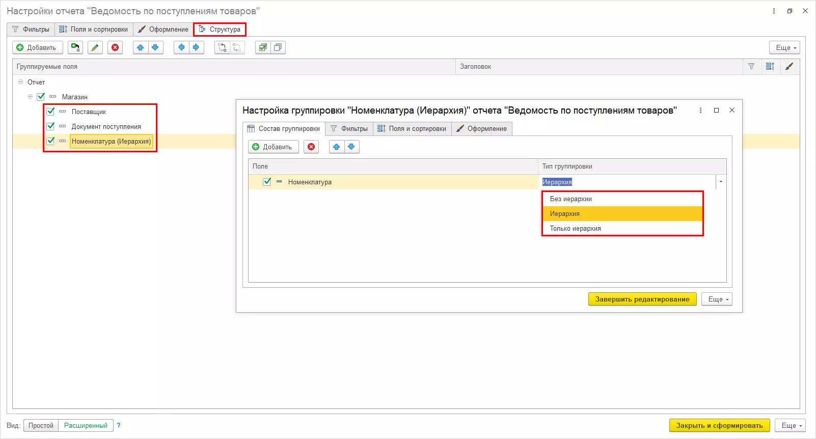 Обратите внимание на настройку Иерархия. Дважды кликнув по строке, в открывшейся настройке можно установить: