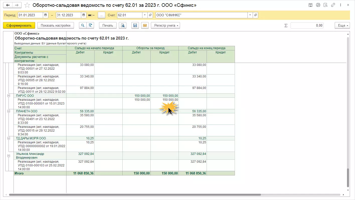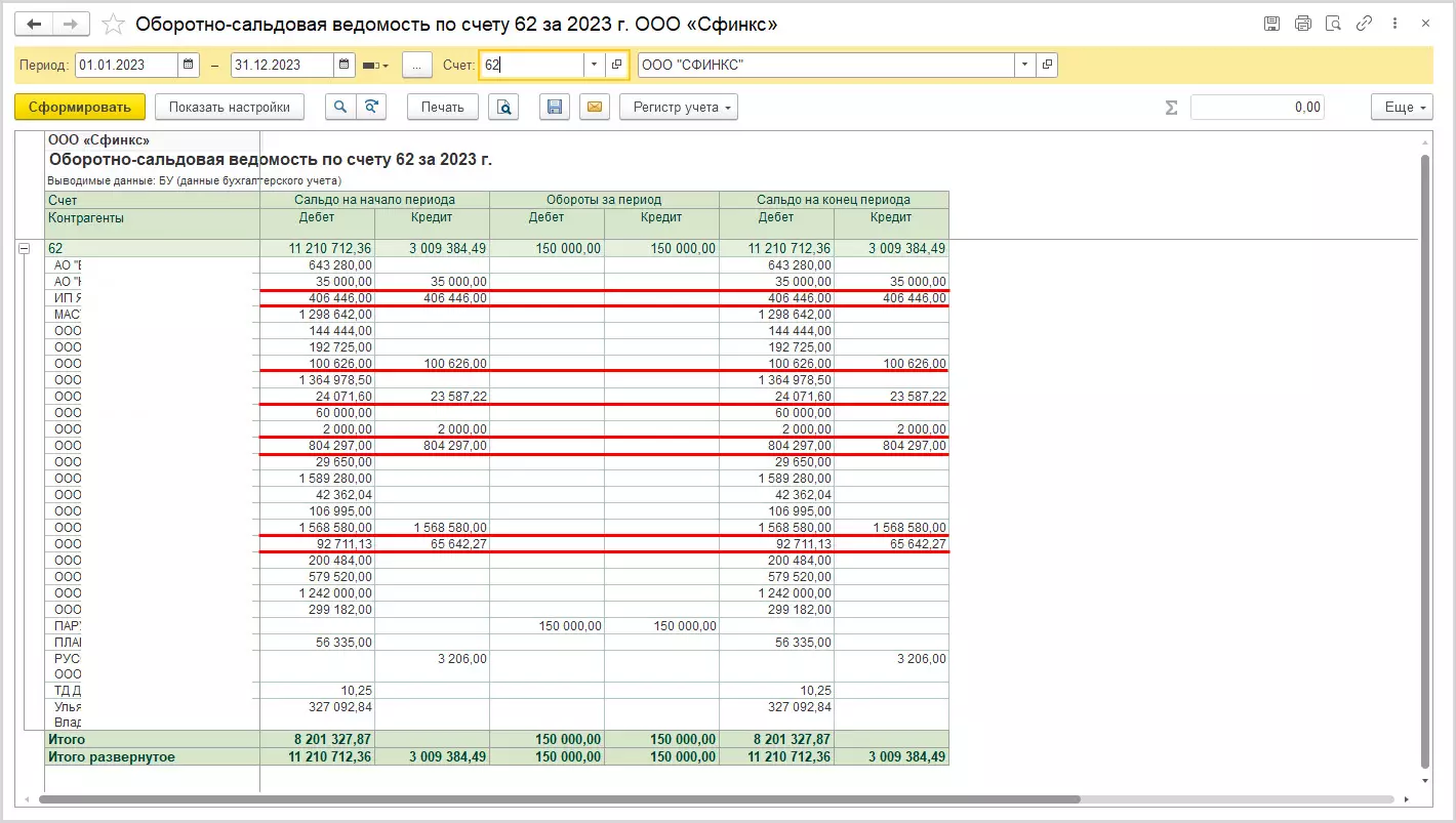 Пример ОСВ по счету 62 с развернутым сальдо по ООО «Сфинкс». По выделенным строкам видно, что сальдо развернулось по дебету и по кредиту, т.е. это суммы авансов покупателей (кредит) и их задолженность (дебет). Если бы «оборотка» была сформирована в общем, без детализации по контрагентам, данный факт не так бросился бы в глаза. Так как отчет сформирован в разрезе контрагентов, к таким «развернутым суммам» надо присмотреться. Развернутое сальдо по контрагенту говорит о том, что возможно некорректно зачелся (или вовсе не зачтен) аванс покупателя.