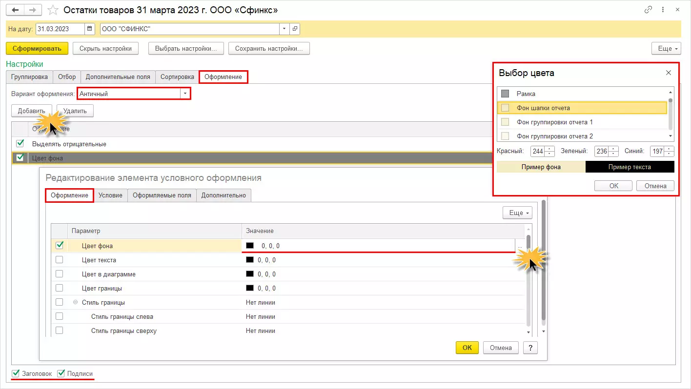 На вкладке пользователь может выбрать вариант оформления из предопределенных вариантов – в нашем примере Античный, а также добавить свой вариант оформления и задать условие форматирования отчета – кнопка Добавить.