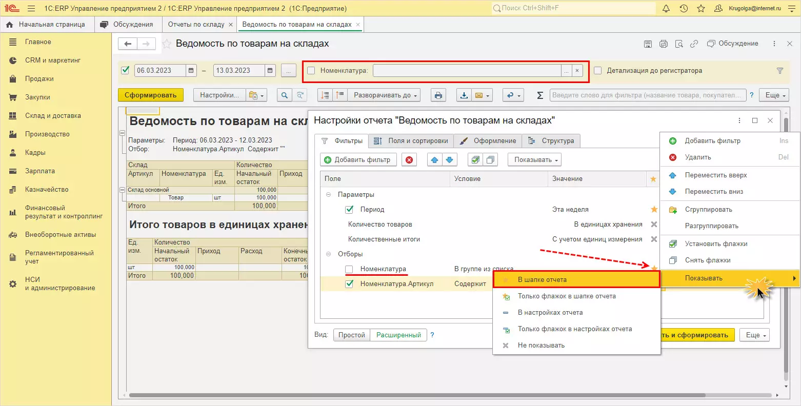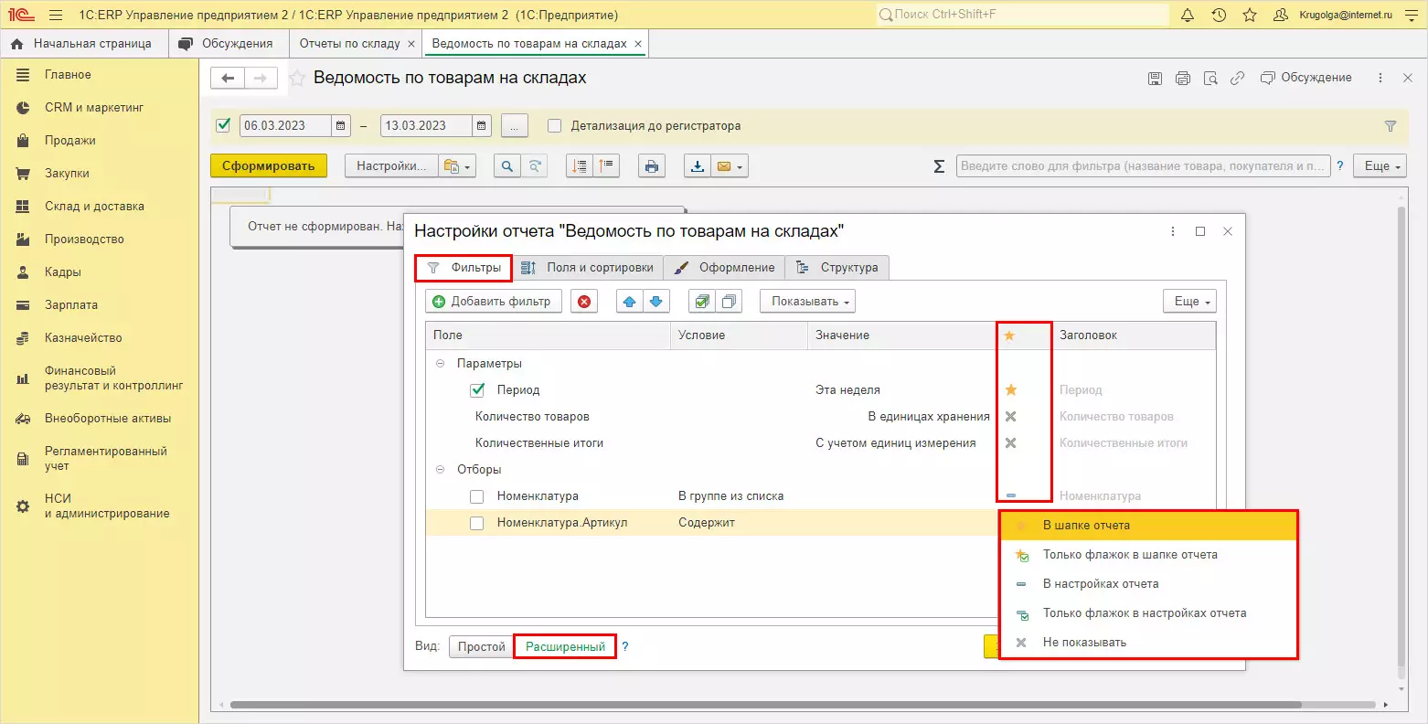 Для каждого отчета свои поля настройки. Ниже пример отчета Ведомость по товарам на складах – 1С:ERP.
