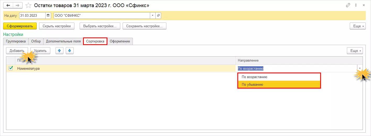 Данный раздел настройки говорит сам за себя. Но без группировки эта настройка менее интересна. В нашем примере устанавливаем вариант сортировки по номенклатуре – по убыванию.