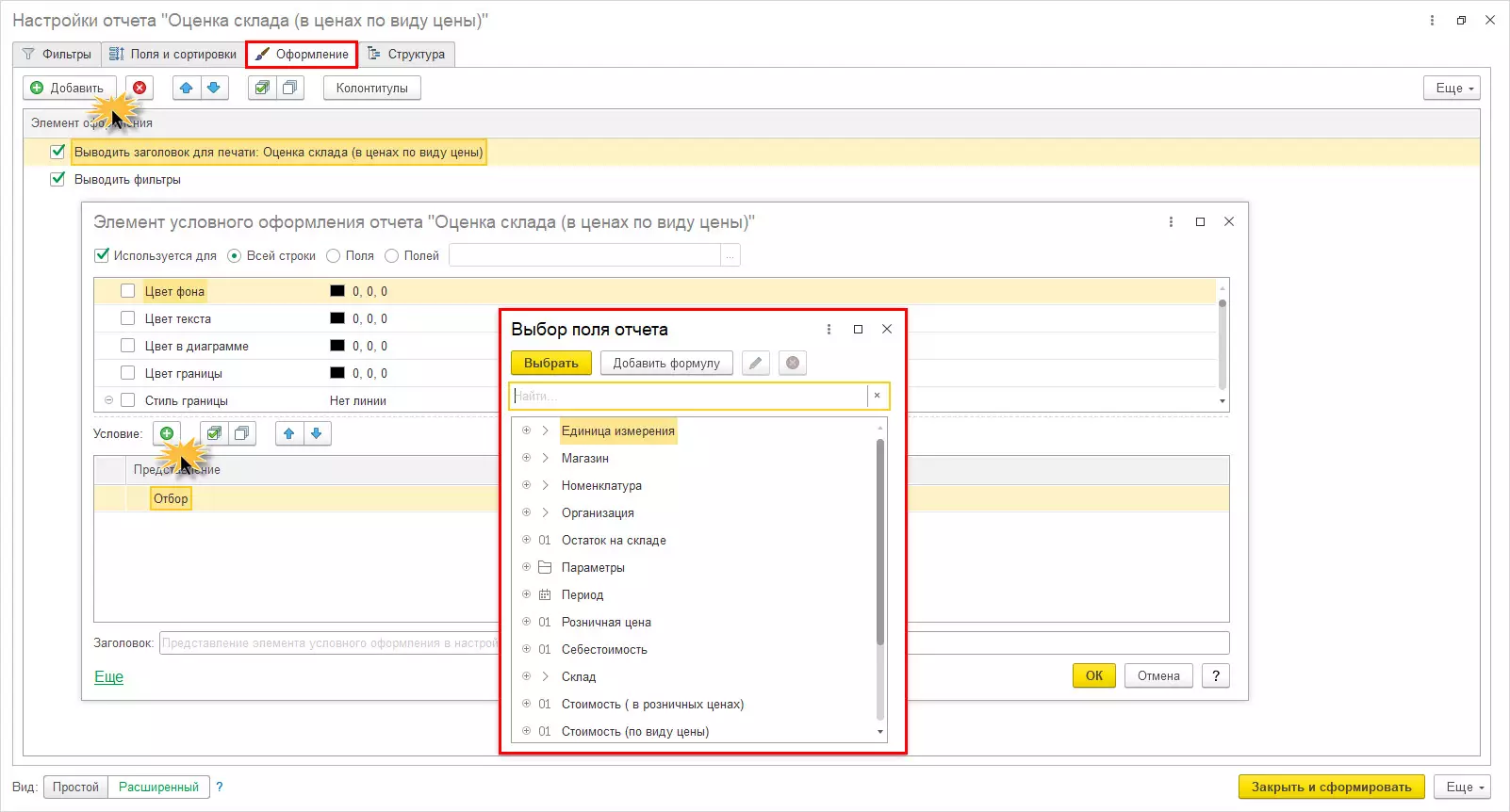 Нажав кнопку Добавить, пользователь может задать условия для оформления отчета – выделить фон, шрифт и т.п.