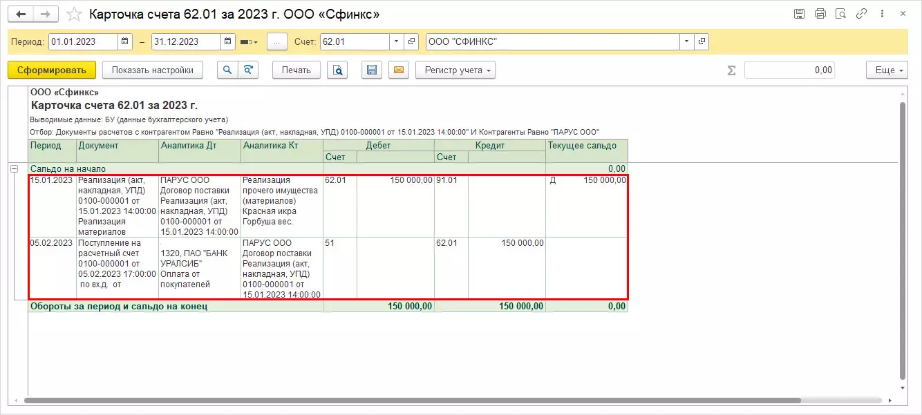 В данном примере задается счет, по которому формируется отчет. В соответствии с этим отбором дополнительные настройки отчета отличаются. Например, для счета 62.01 «Расчеты с покупателями и заказчиками» по нажатию Показать настройки отражены настройки для данного счета и зависят от субконто, определенных разработчиком в плане счетов.