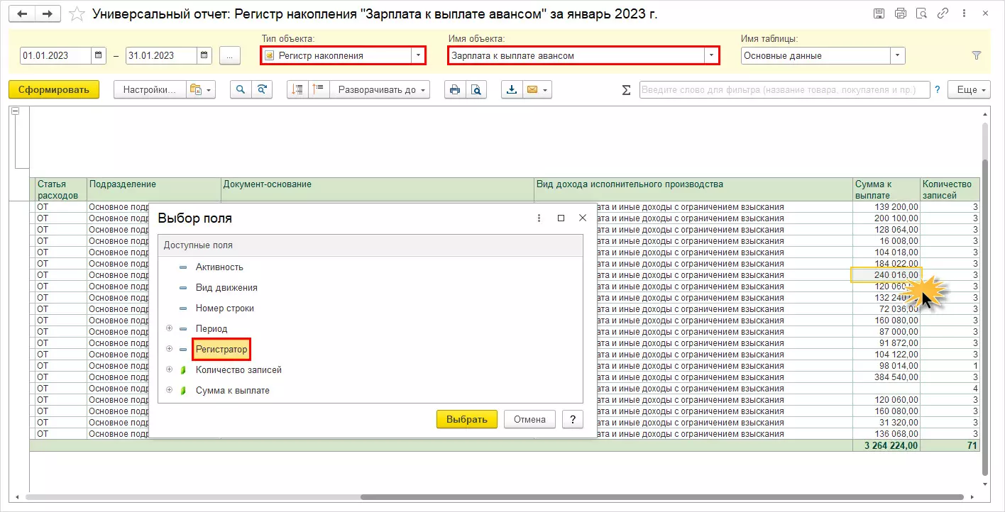 Шаг 2. Укажите тип данных Регистр накопления. Интерфейс шапки изменится в зависимости от выбранного типа данных. Далее в поле Имя объекта укажите нужный регистр. В нашем примере – Зарплата к выплате авансом.