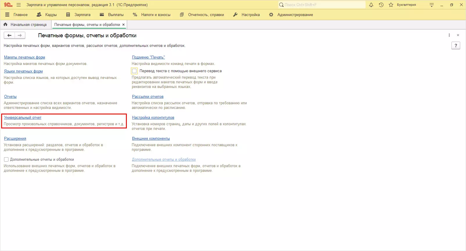 В таких ситуациях поможет анализ регистров, на основании которых производится заполнение документа или формирование отчета. Его можно произвести с помощью Универсального отчета. Он есть во всех конфигурациях 1С в разделе Администрирование – Печатные формы, отчеты и обработки. Но может располагаться в других разделах.