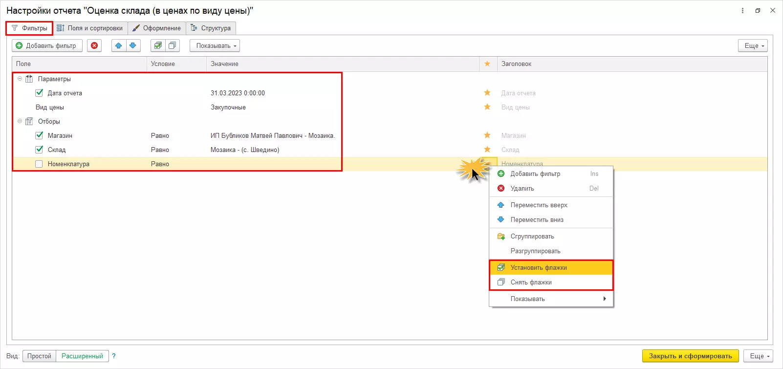 На вкладке Фильтры отражены те же отборы, что доступны пользователю в шапке отчета – дата, магазин, склад, номенклатура.