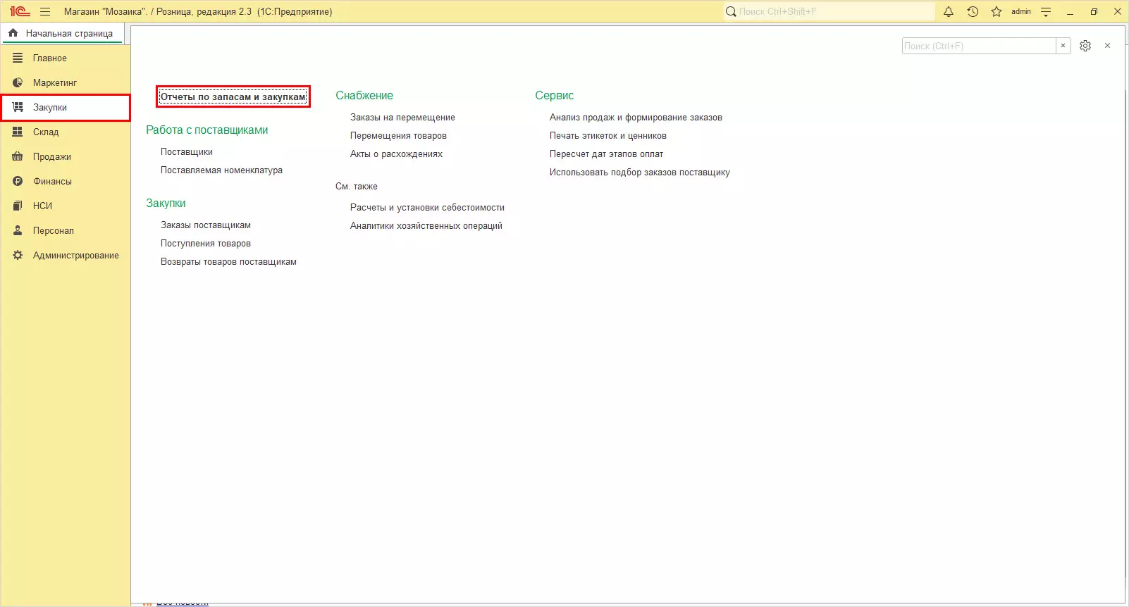 Отчеты могут быть сгруппированы в подразделы, смысловые блоки. Например, «Отчеты по запасам и закупкам» в разделе «Закупки» – 1С:Розница.