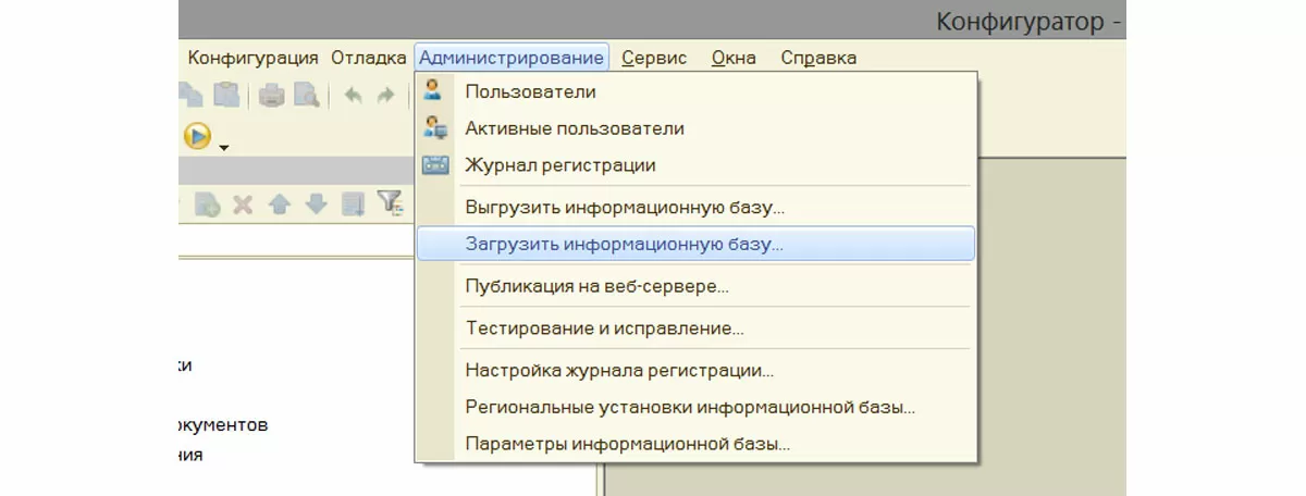 Сам процесс восстановления базы предельно прост. Запускается информационная база «1С:Предприятие» в режиме «Конфигуратор», а в меню «Администрирование» выбирается пункт «Загрузить информационную базу…»: