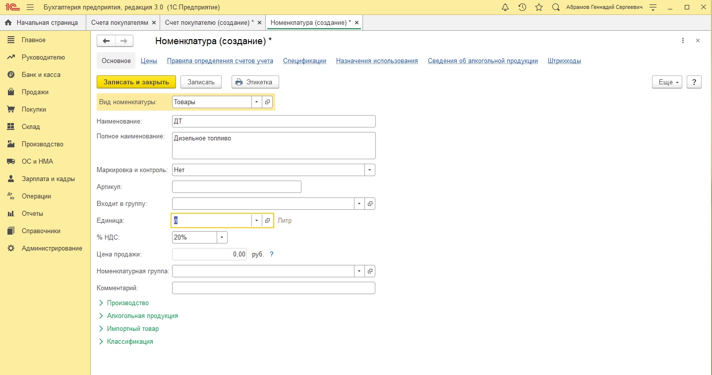 В нижней части документа имеются кнопки «Добавить/Подбор/Изменить», позволяющие вносить и редактировать наименование товара или услуги в счете. При нажатии кнопки «Добавить» открывается окно номенклатуры товаров, в котором последовательно можно ввести продаваемую компанией продукцию (в нашем случае это горюче-смазочные материалы). Кнопка «Подбор» позволяет увидеть весь перечень товаров, а также количественные остатки на текущий момент по каждому их наименованию на складе. По очереди заполняем поля полного и краткого наименования товара, его номенклатурной группы, единицы измерения. Цена реализации устанавливается по умолчанию на основании типа цен, предусмотренного по договору, а при необходимости может быть отредактирована.