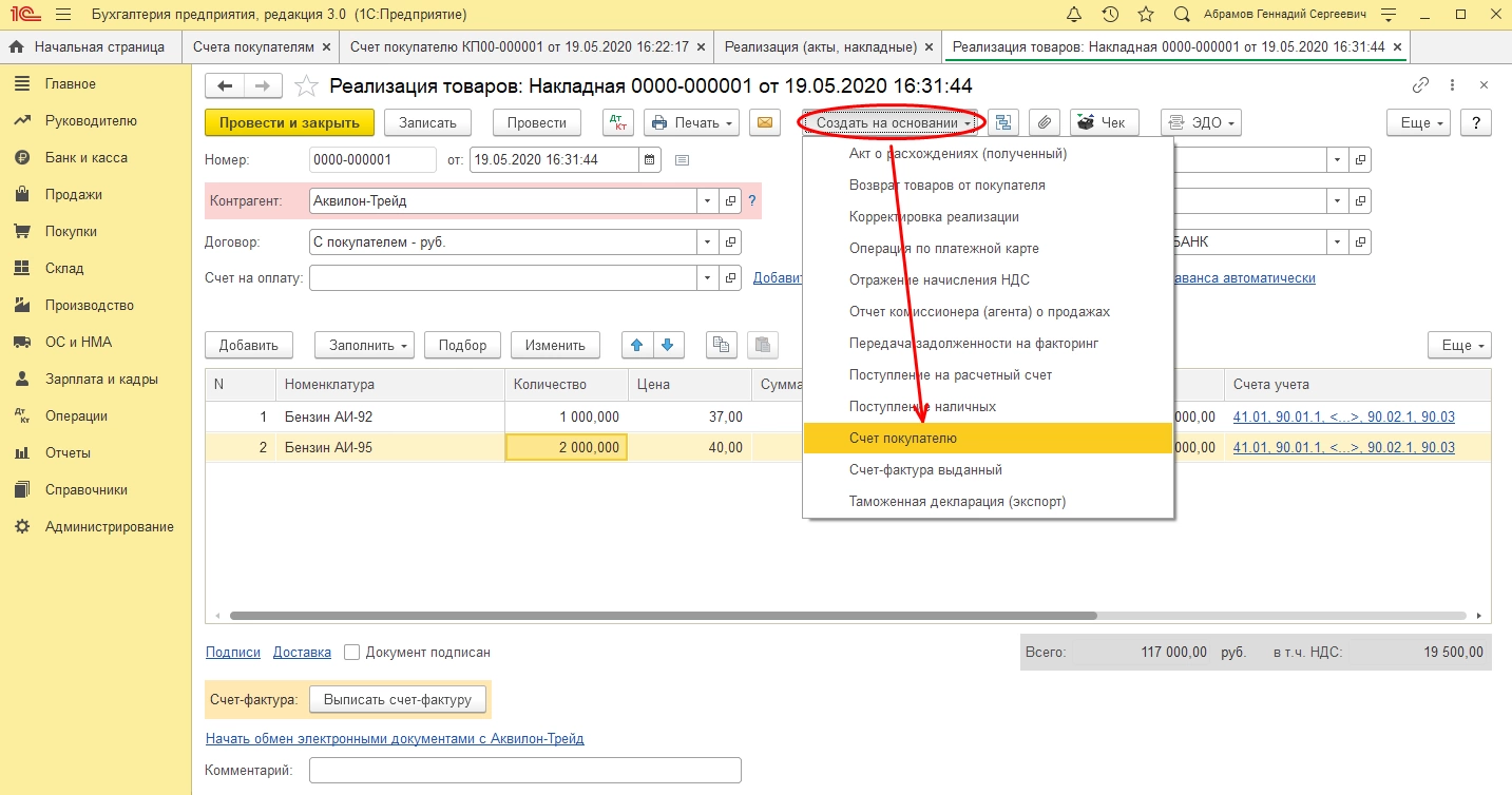 Выбираем строку «Счет покупателю»: программа позволит автоматически создать счет на оплату, перенеся все строки реализованного товара из накладной.