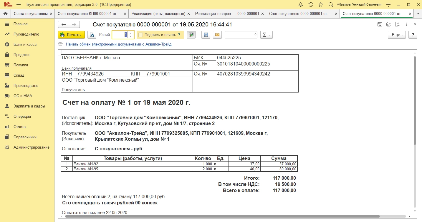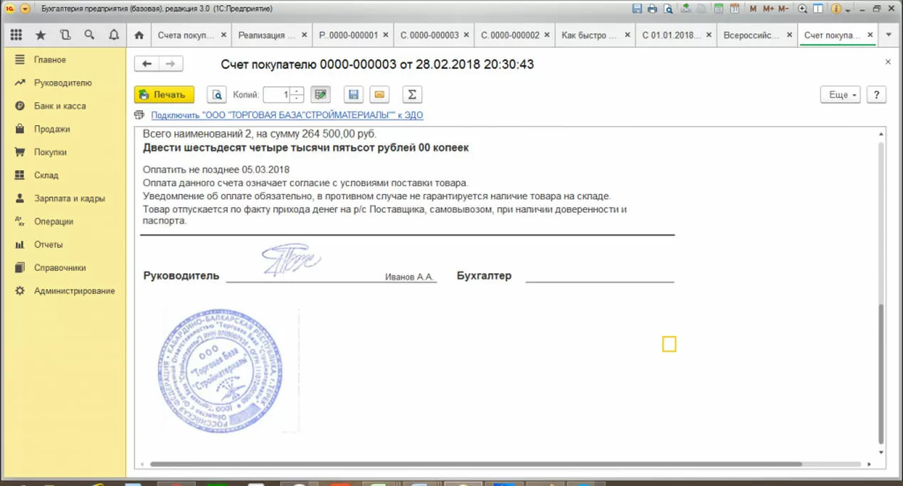 Выбрав из меню «Счет на оплату с печатью и подписями» мы получаем документ уже с проставленными реквизитами.
