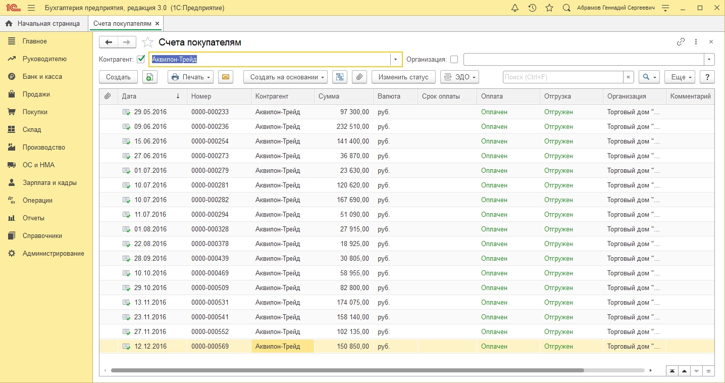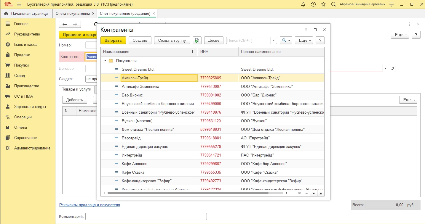 Выбрав нужного контрагента, переходим непосредственно к созданию искомого документа. Сделать счет на оплату в 1С возможно как в рамках предоплаты, так и после отгрузки товара. В нашем примере мы рассмотрим оба варианта выставления счета.
