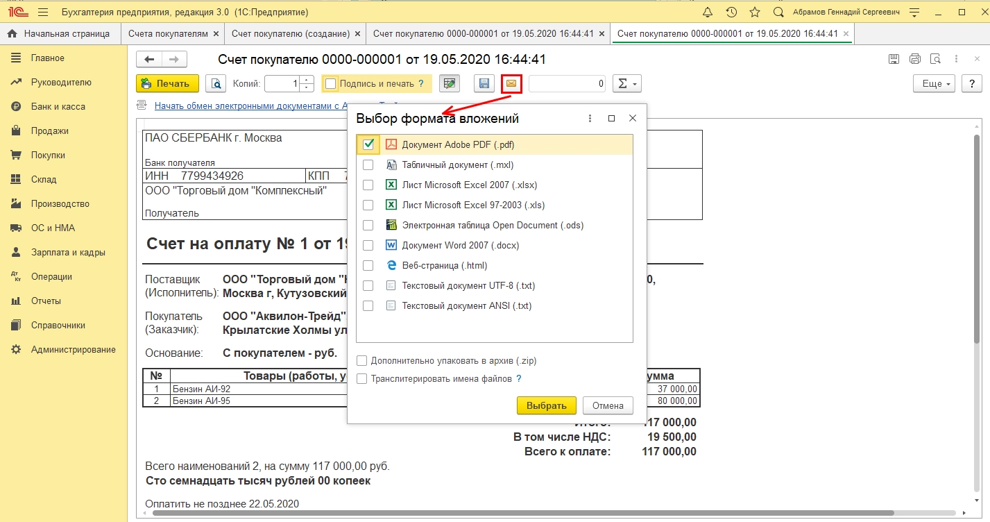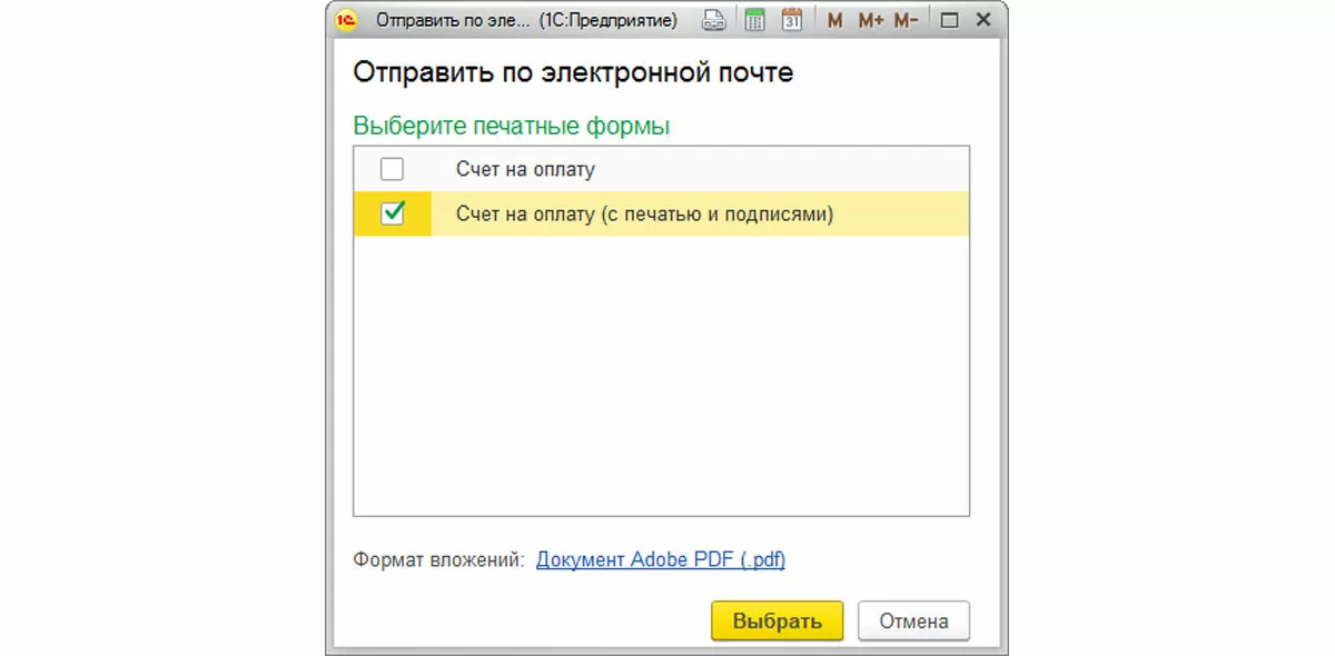 При желании сформированный документ можно прямо из системы отправить контрагенту посредством электронной почты. Нажав на иконку конверта, можно отправить документ в одном из предоставляемых 1С Предприятие 8.3 форматов файлов.