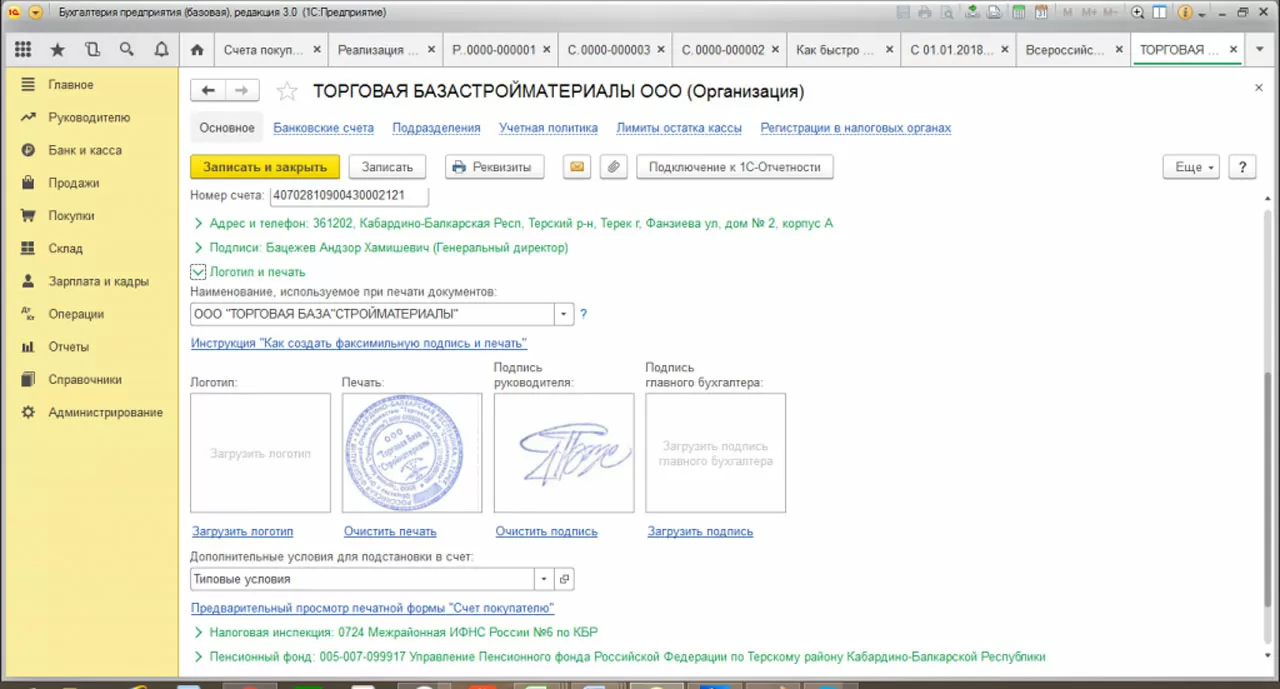 Также одним из преимуществ продуктов 1С является создание электронных документов с печатью и подписью руководителя. Для этого в реквизитах организации нужно заполнить графы «Логотип» и «Печать».