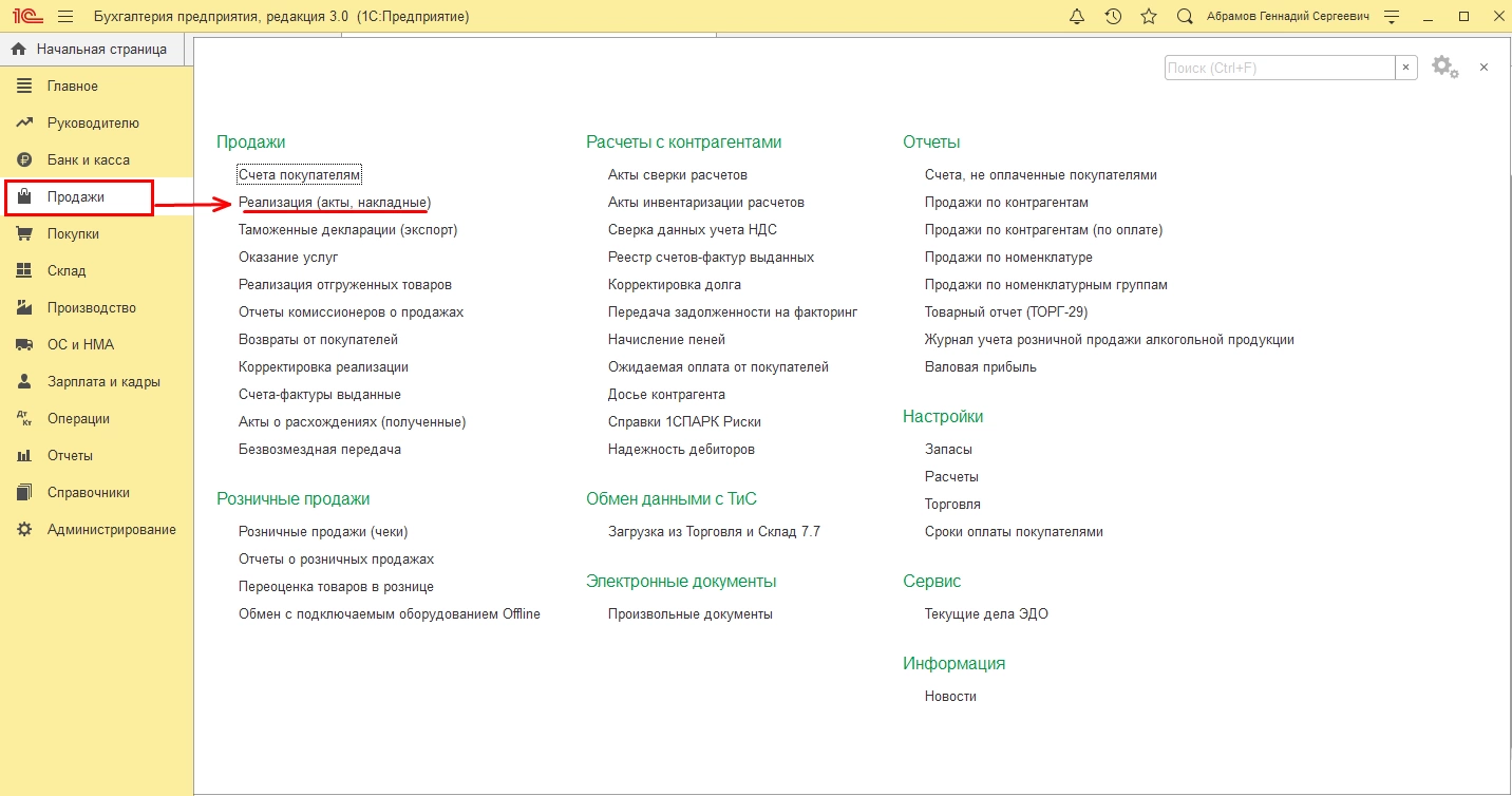 Рассмотрим вариант выставления счета на оплату при отгруженной продукции. Для этого перейдем в меню «Продажи/Реализация (акты, накладные».