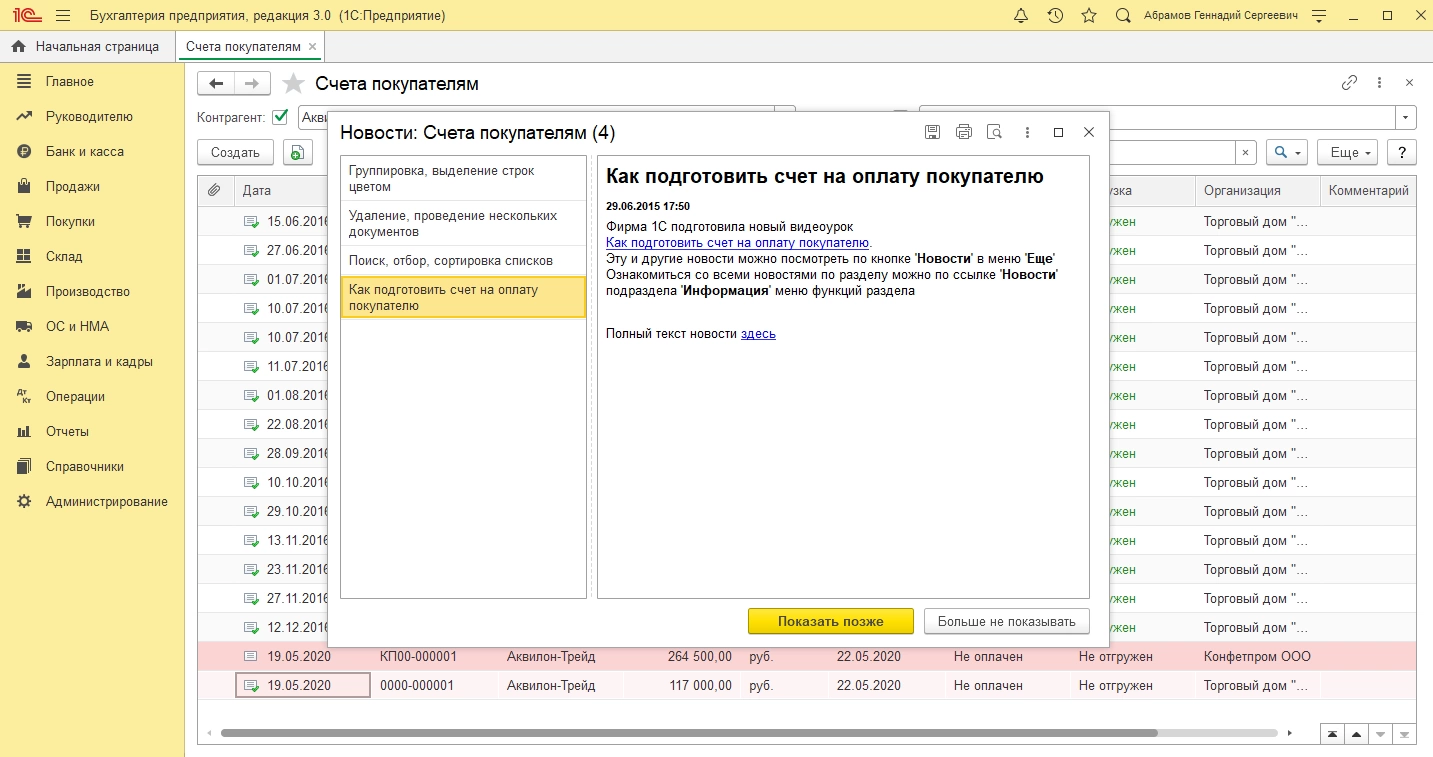 Обратите внимание, что при внесении изменений в какой-либо модуль 1С создается автоматическая новость с подробным описанием и даже видеоуроком, касающимся введенного новшества. Система позволяет просмотреть новость немедленно или по желанию напомнит позже, при следующем обращении к данному модулю.