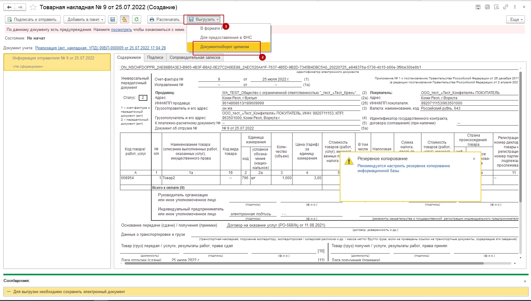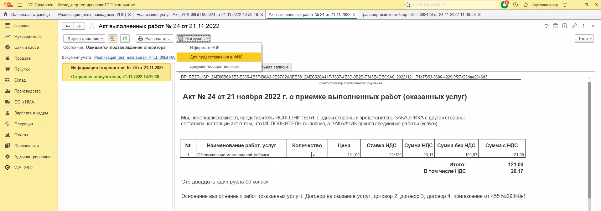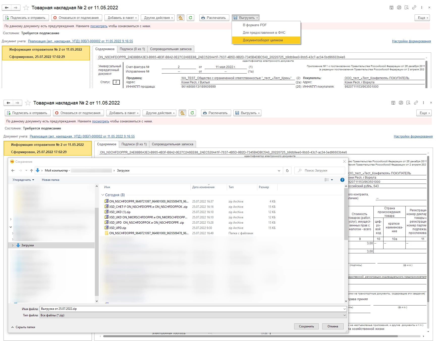 Для того, чтобы выгрузить файл XML УПД из 1С, необходимо: