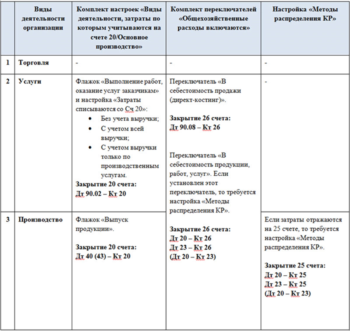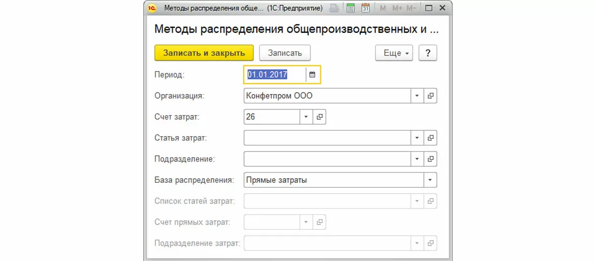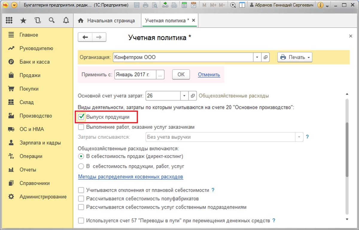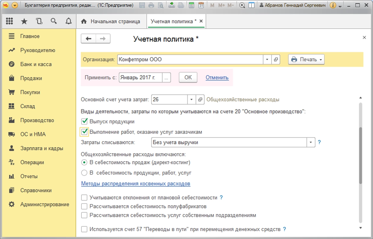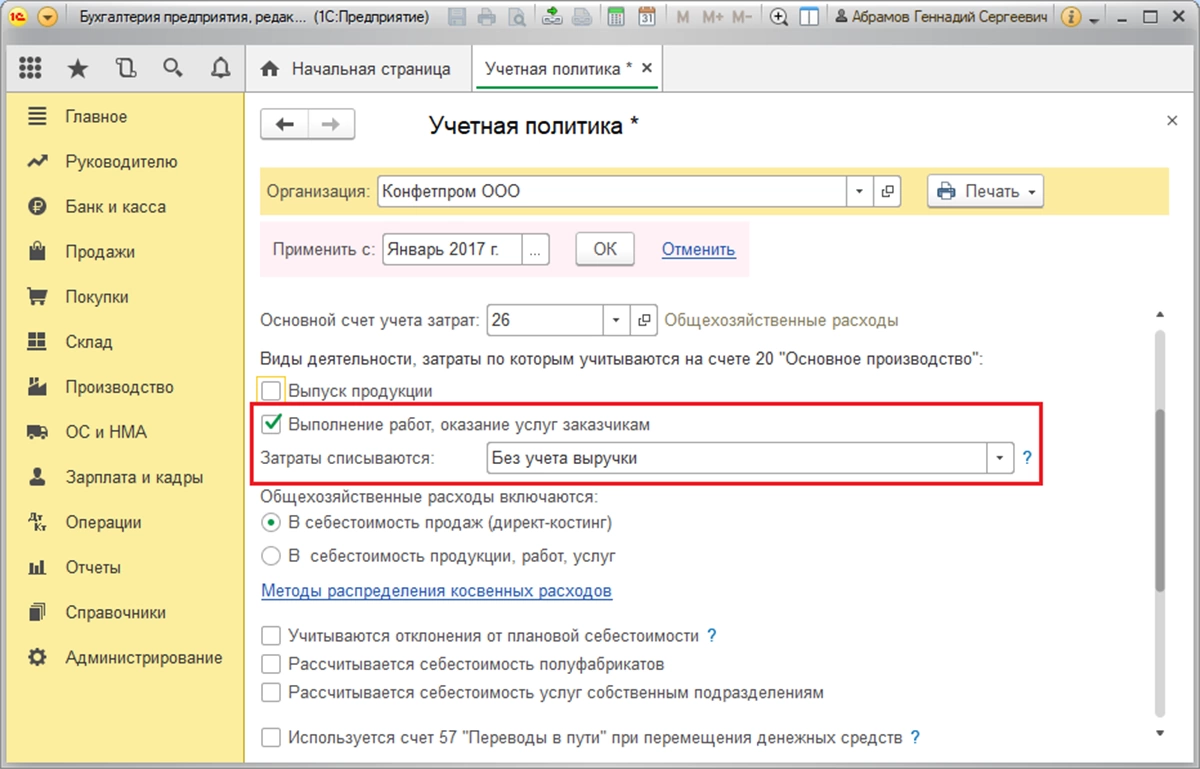 Коммерческие структуры, бизнес которых строиться на услугах производителям, ставят галочку напротив «Выполнение работ/оказание услуг…», чтобы настроить «Затраты списываются» по какому-то из вариантов: