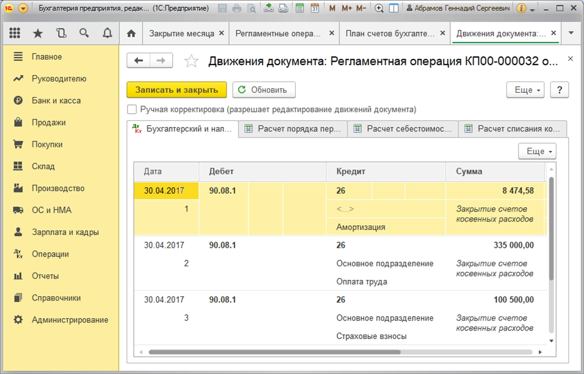 Закрытие 25 счета, а также 20, 23 и 26, реализуется посредством соответствующей регламентированной операции, которая находится в разделе «Операции/Закрытие периода/Закрытие месяца» или «Операции/Закрытие периода/Регламентные операции».