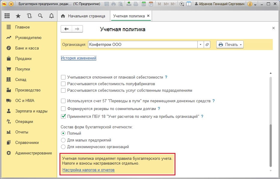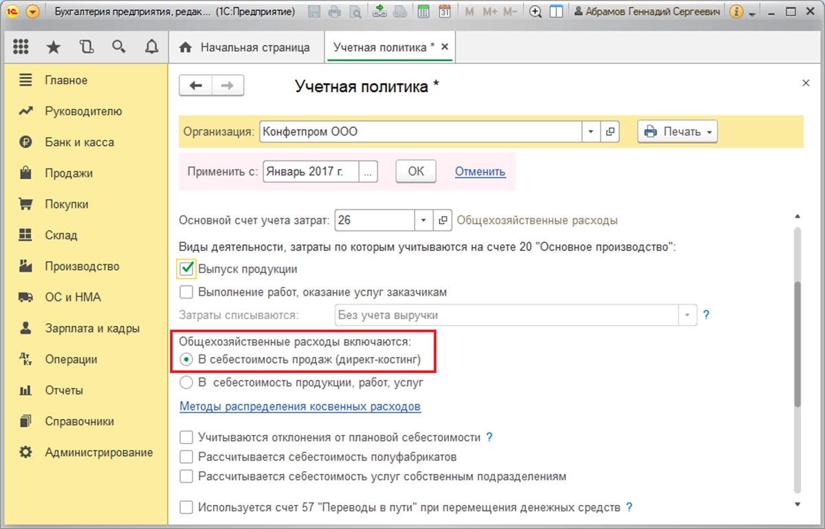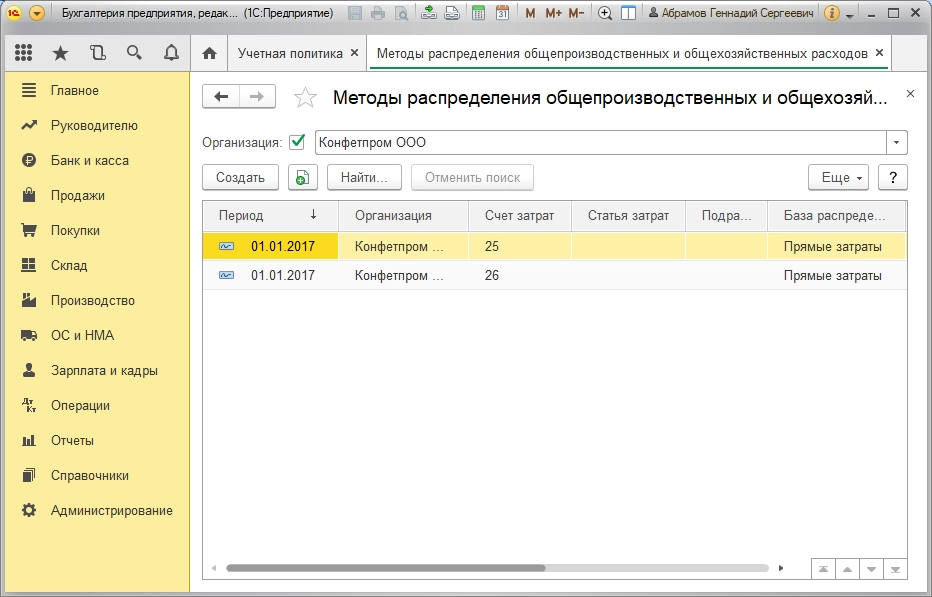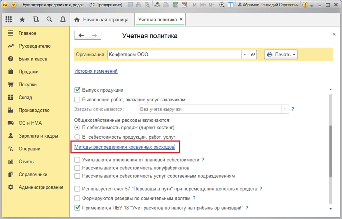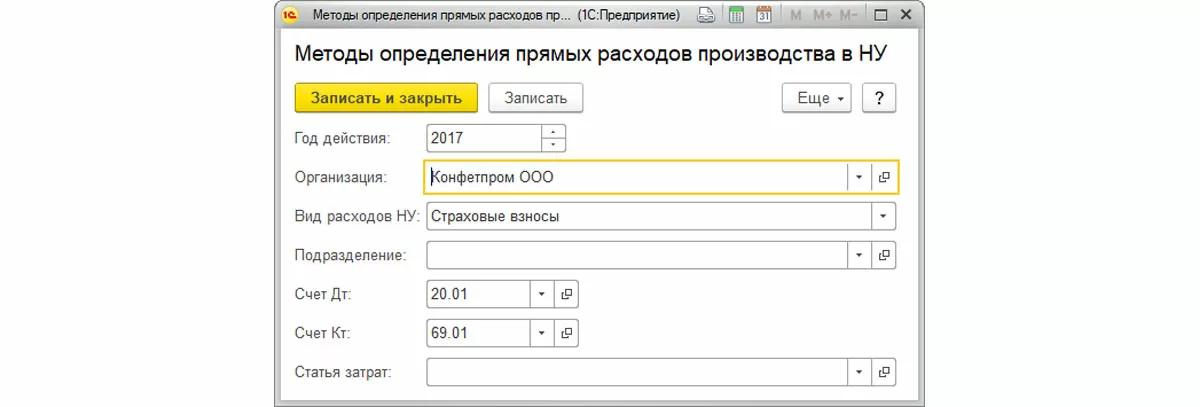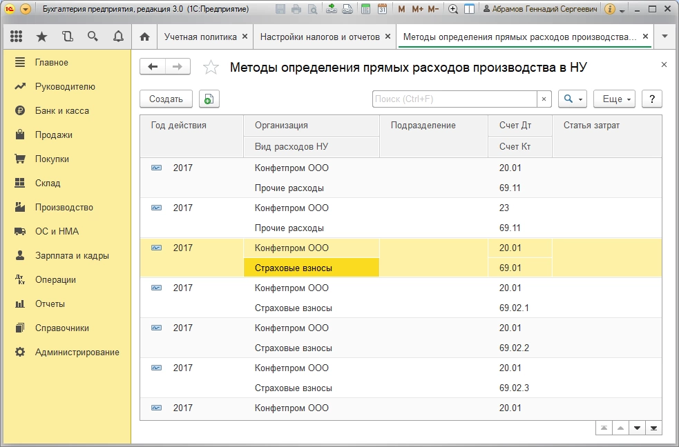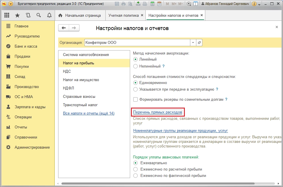 Список прямых трат, причисляемых к производству, находится в разделе «Главное/Учетная политика/Настройка налогов и отчетов/Налог на прибыль/Перечень прямых расходов».
