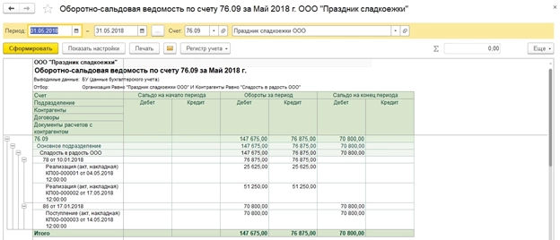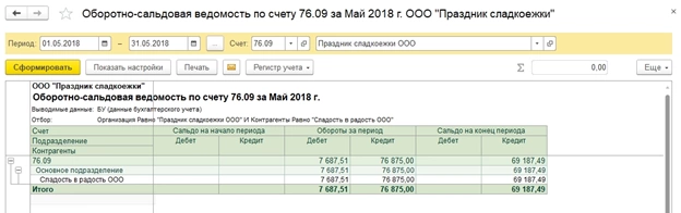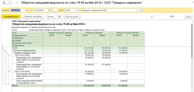 Нам удалось провести отчет комитенту, и по итогу на счете 76.09 можно увидеть полную задолженность комитента в разрезе документов расчетов.