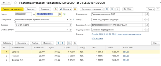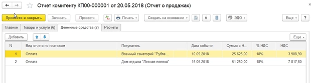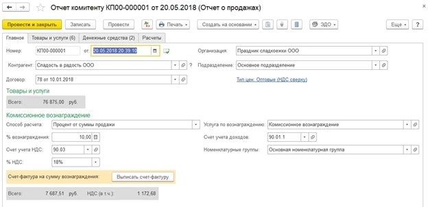 Здесь также используется забалансовый счет учета 004.01 для списания проданных комиссионных товаров. Вместе с проводками по расчету с покупателем. Сформируется проводка Кт 004.01.