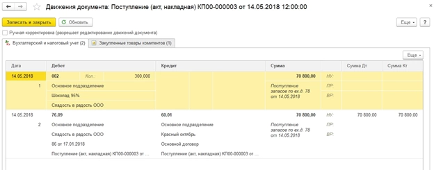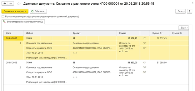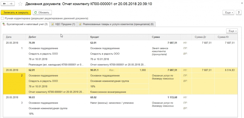 Сформируются проводки, которые учитывают детальные записи по документам реализации и расчетов с покупателями.